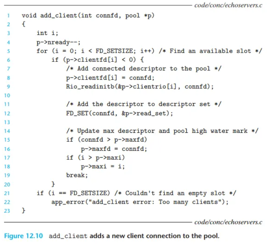 clientfd 배열은 연결 디스크립터 집합을 나타내며, 1은 사용 가능한 슬롯을 의미합니다.1로 설정합니다(lines 5–7).listenfd가 select의 read_set에 포함된 유일한 디스크립터입니다(lines 10–12). (즉, 처음엔 새 연결만 감시)add_client 함수 (Figure 12.10)