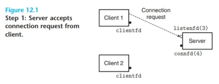 accept)하고, 연결 디스크립터(connected descriptor, 예: 4번)를 반환받습니다. (Figure 12.1)자식 프로세스 생성 (fork)