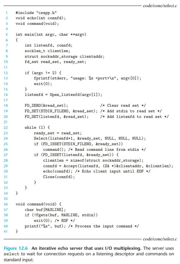 Figure 12.8은 I/O 멀티플렉싱 기반의 동시성 이벤트 기반 서버의 전체 예제 코드입니다.