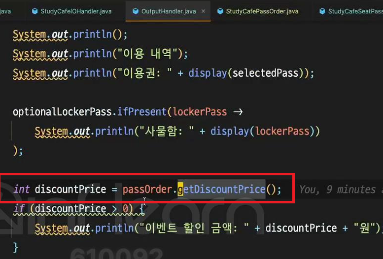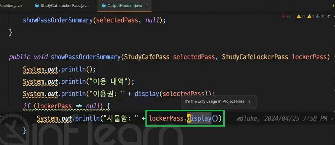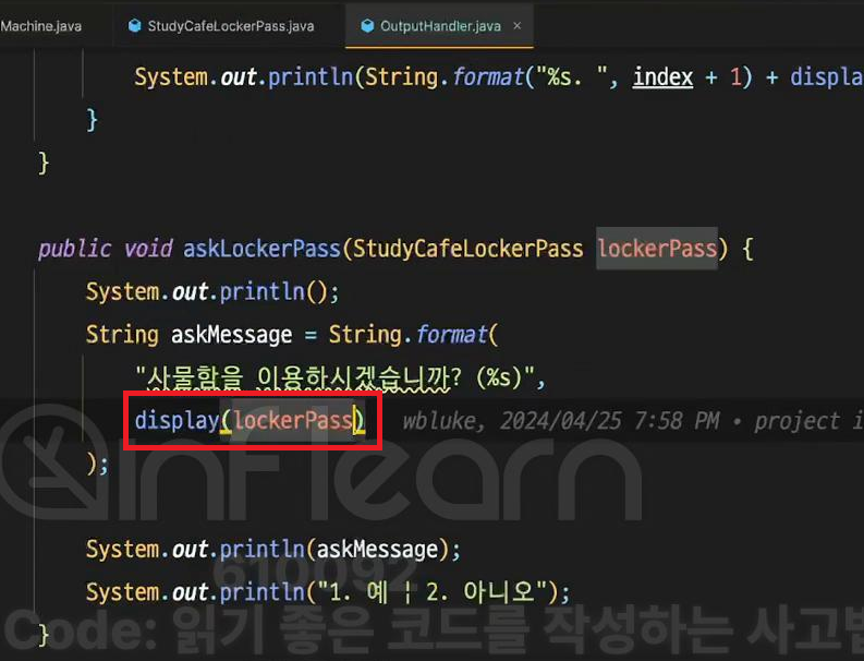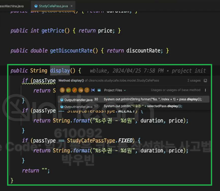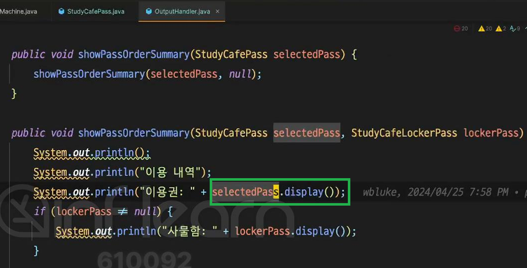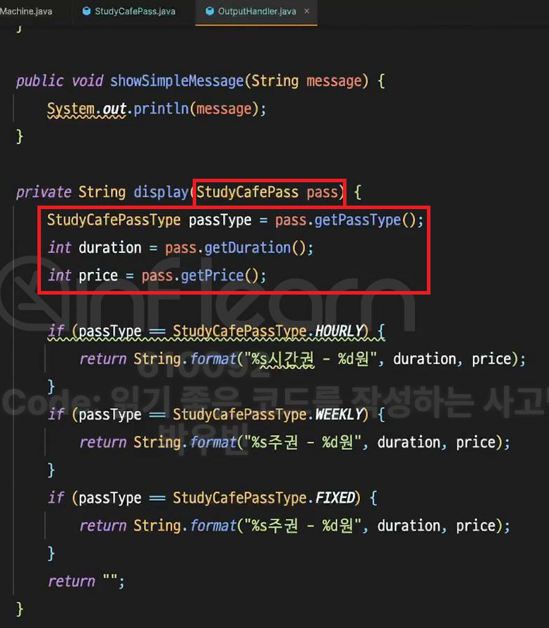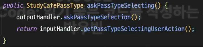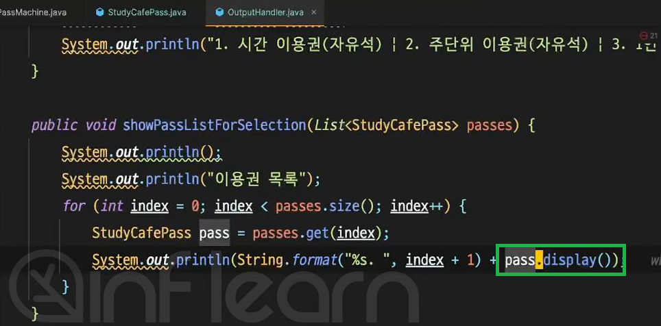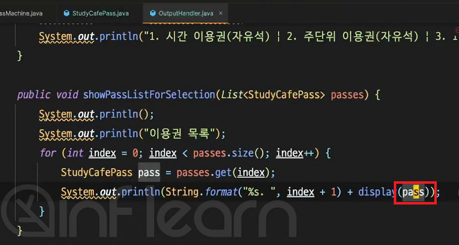 - StudyCafePass에 있는 display() 로직을 OutputHandler로 옮기자.