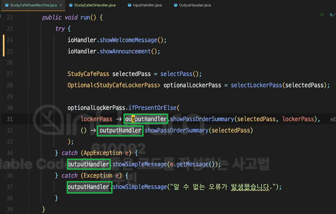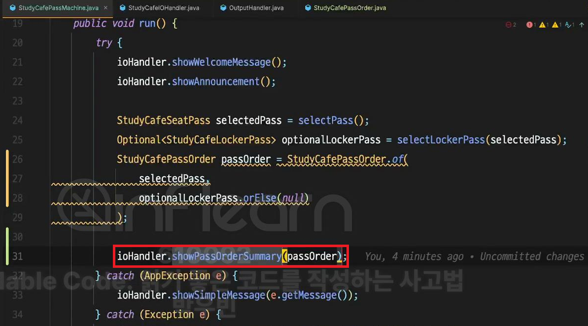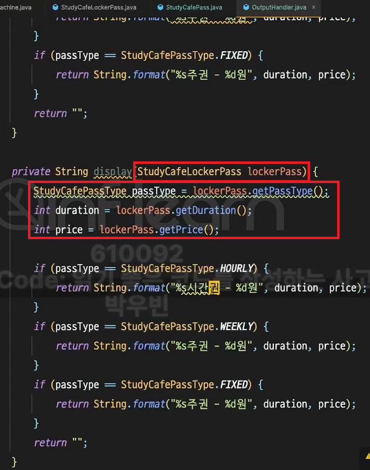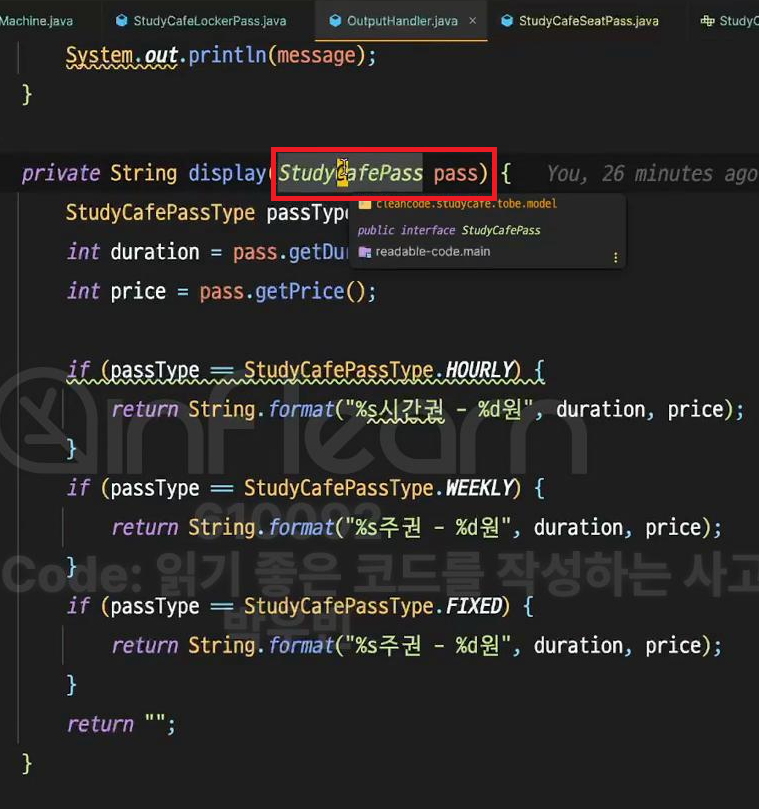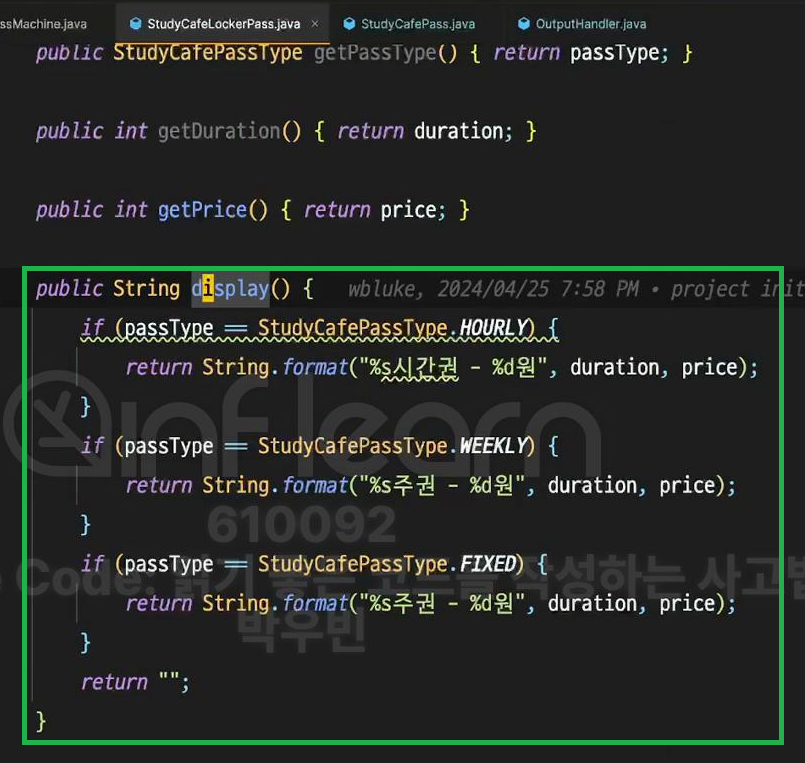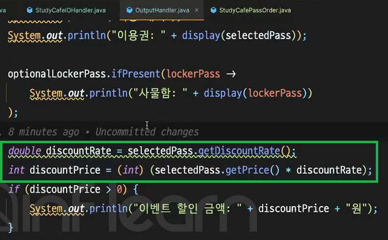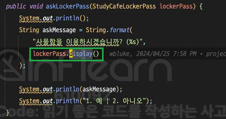 - StudyCafePass에 있는 display() 로직을 OutputHandler로 옮기자.