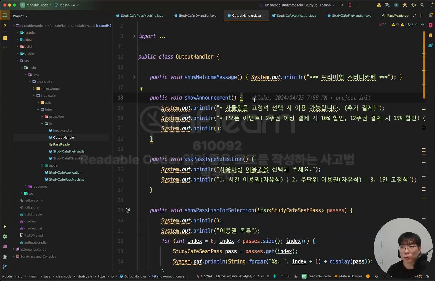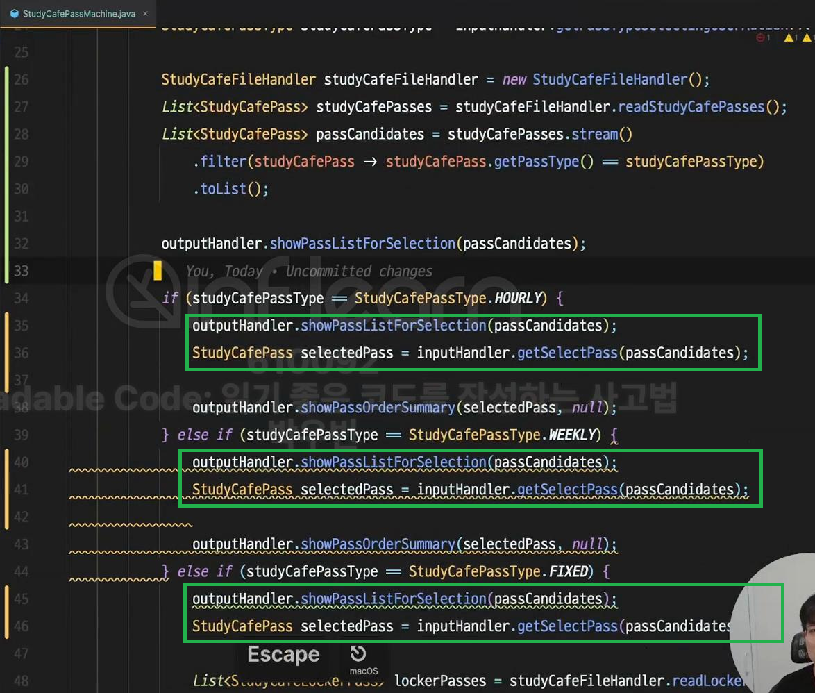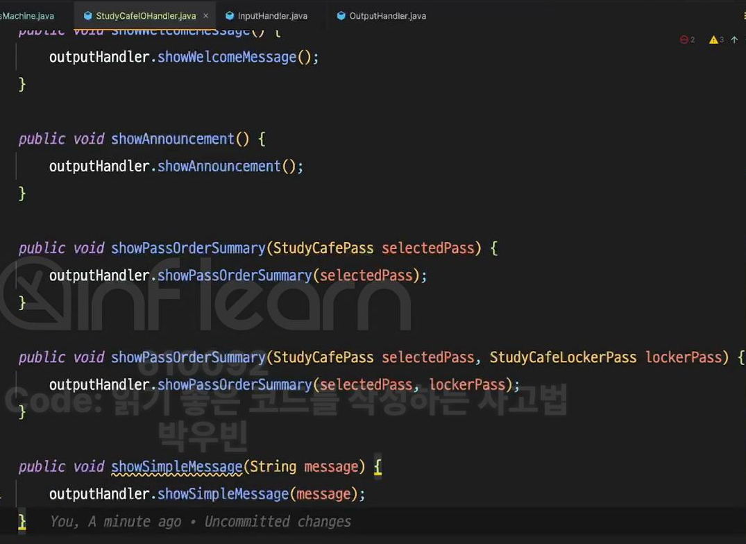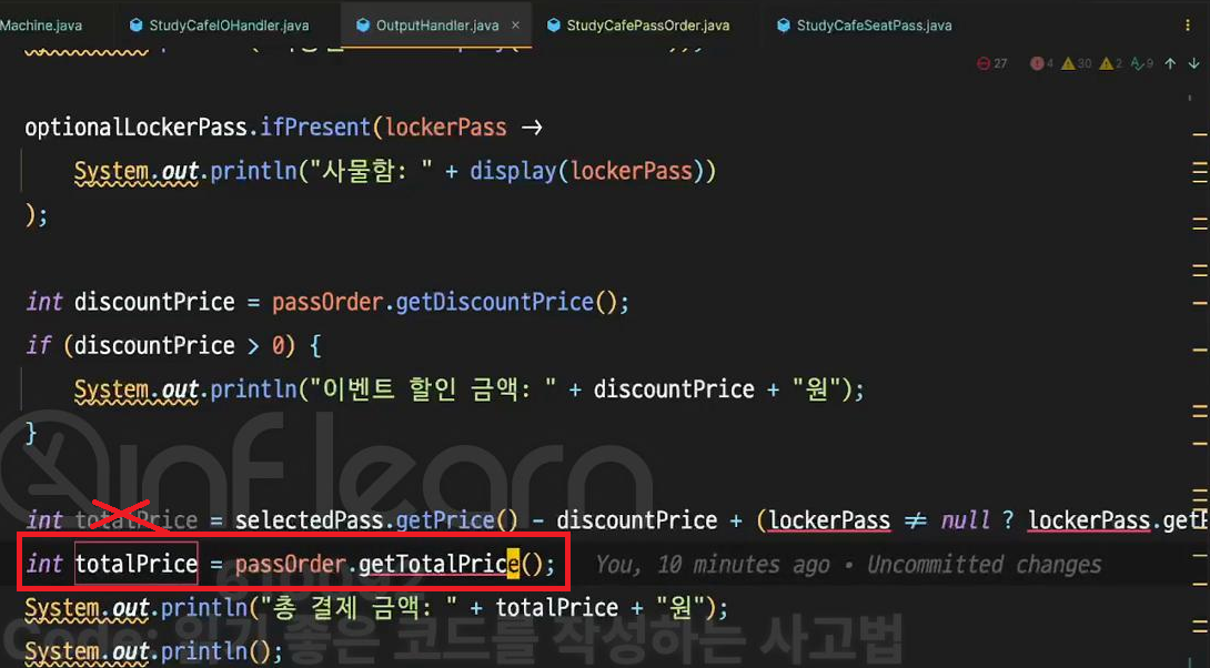 - StudyCafePass에 있는 display() 로직을 OutputHandler로 옮기자.