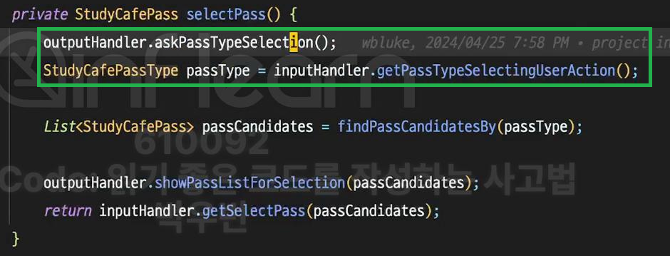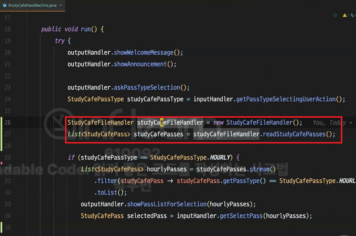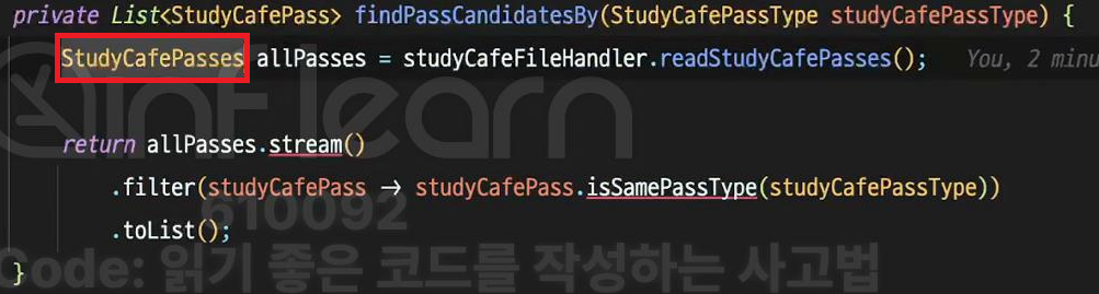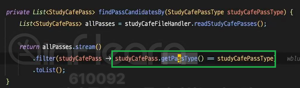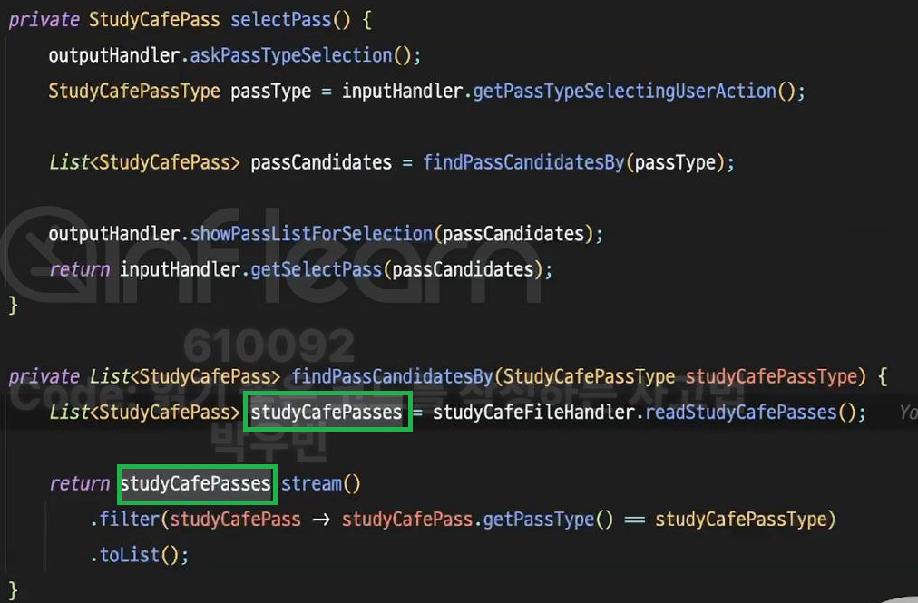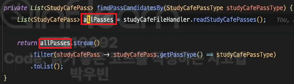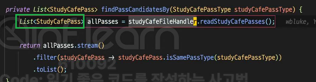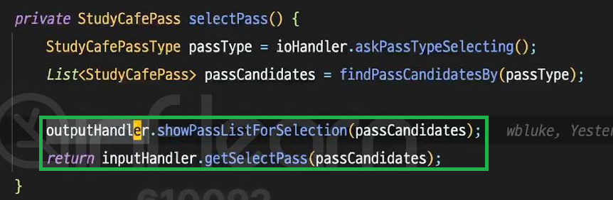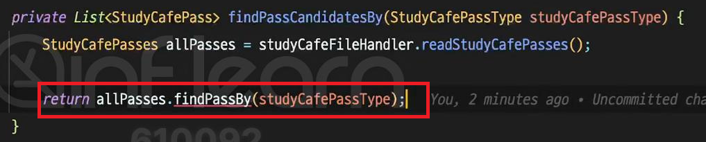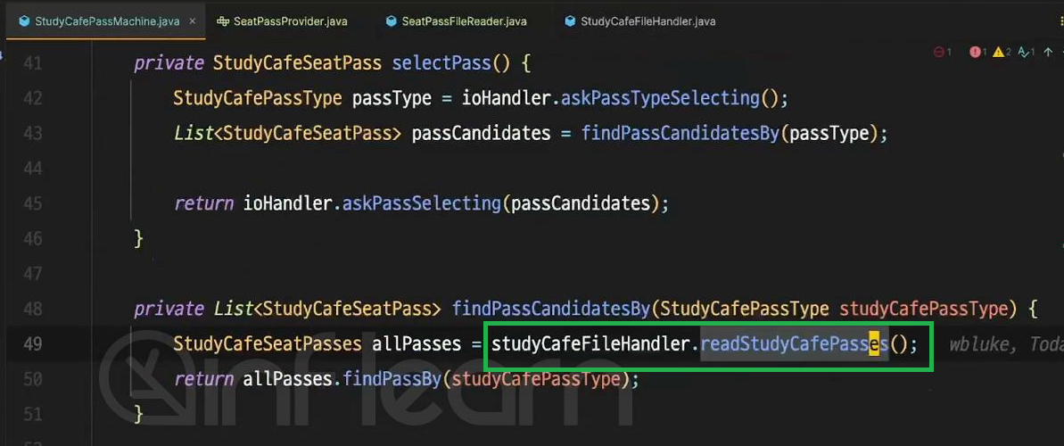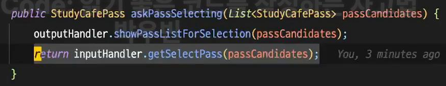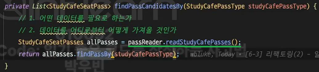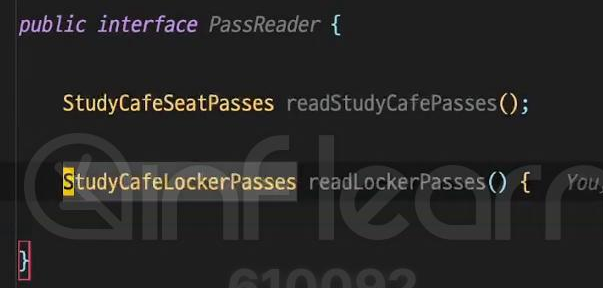 - FileHandler라는 구현체는 passReader로 숨겼는데 기존에 사용하고 있던 readStudyCafePasses()가 애매해졌다.