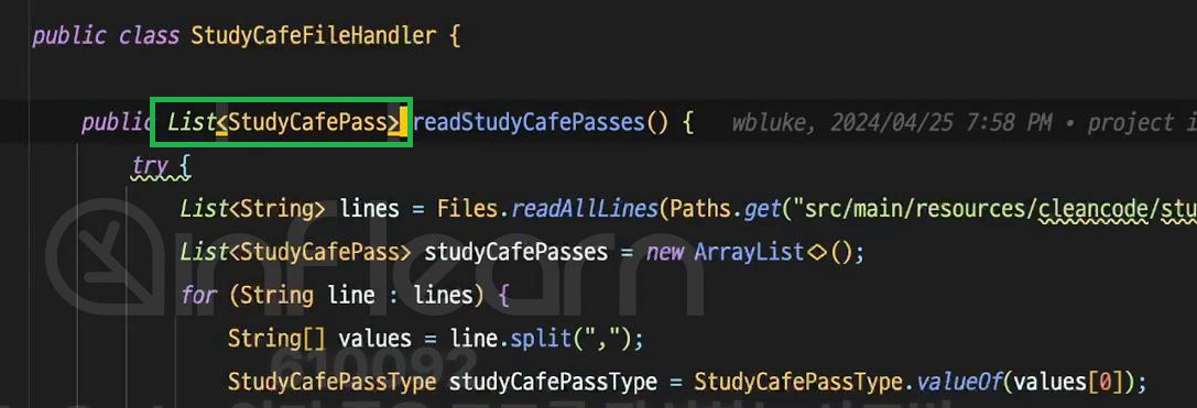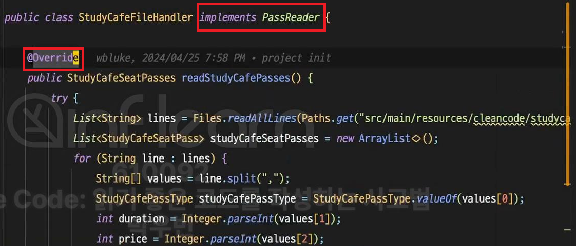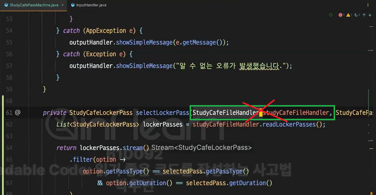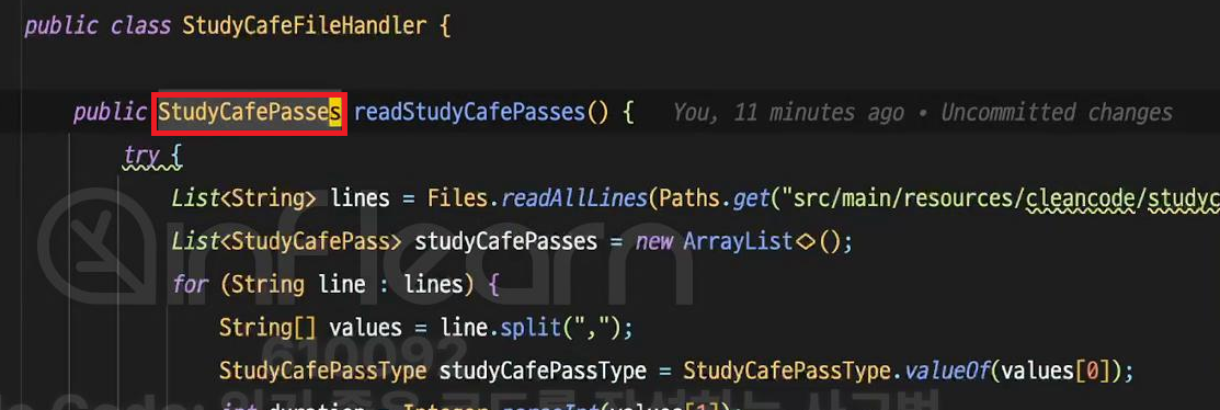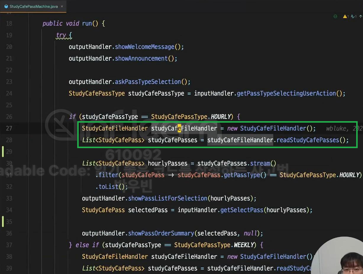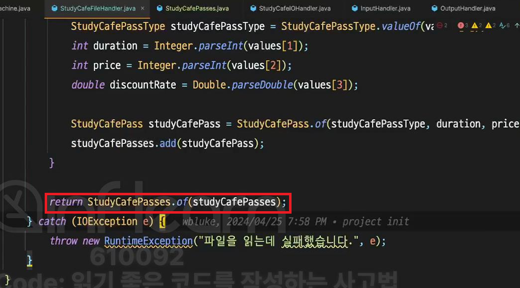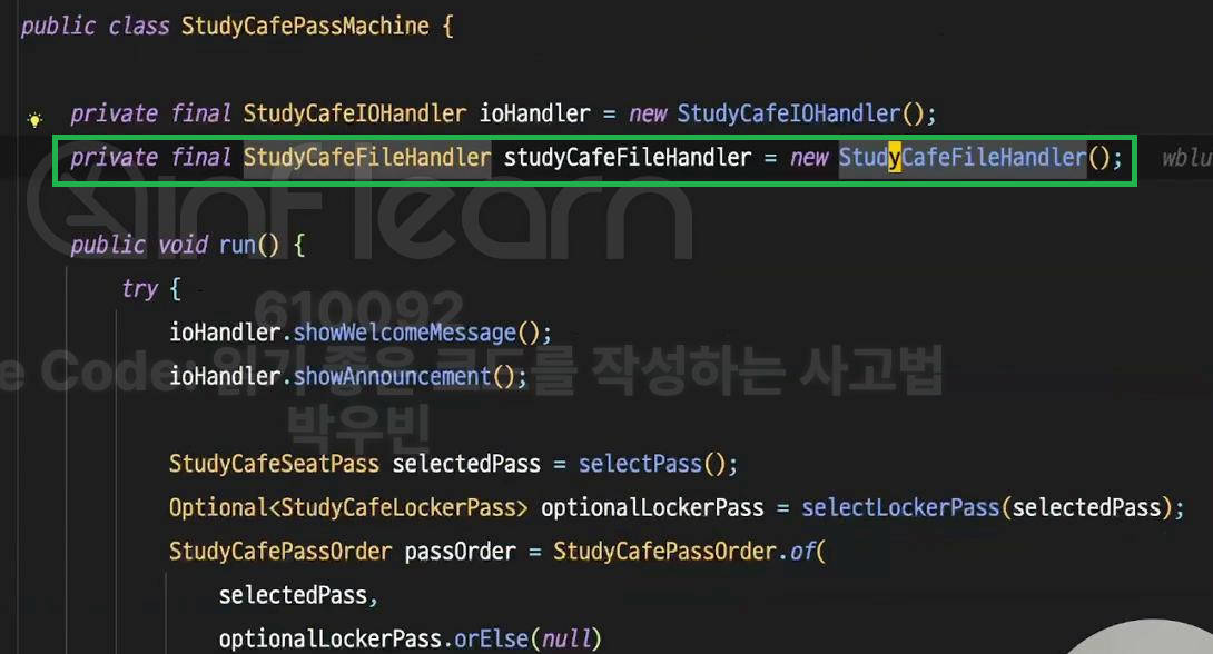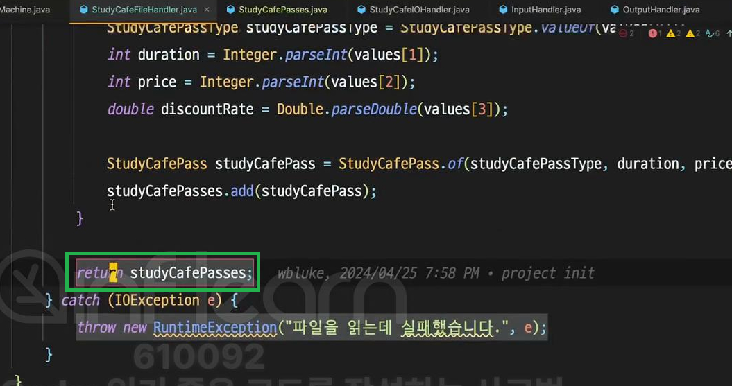 - FileHandler라는 구현체는 passReader로 숨겼는데 기존에 사용하고 있던 readStudyCafePasses()가 애매해졌다.