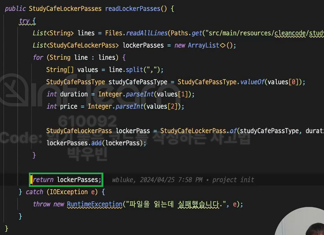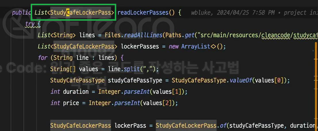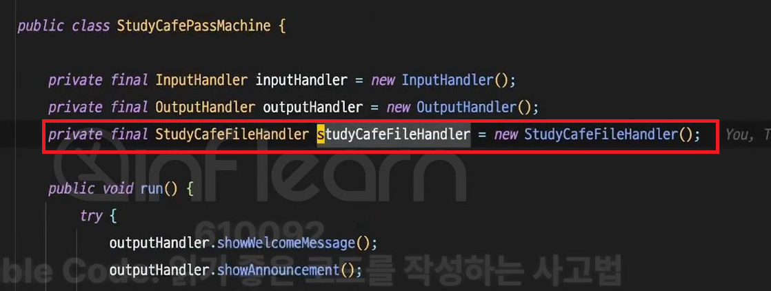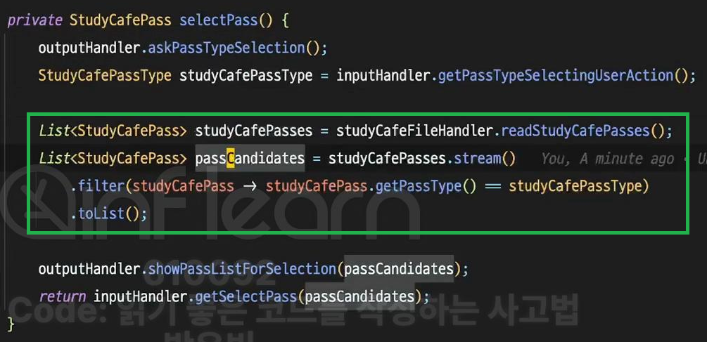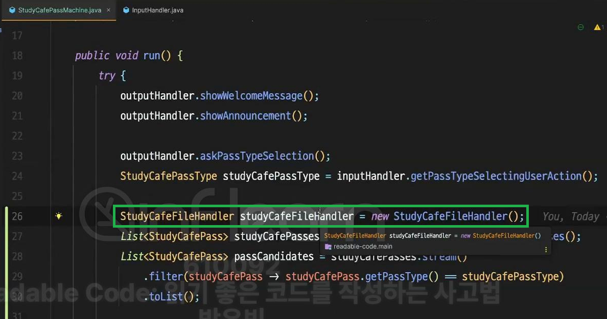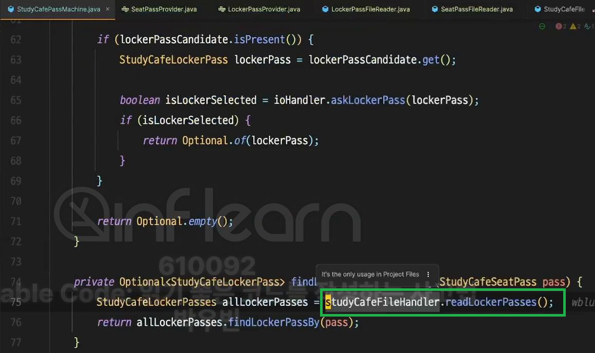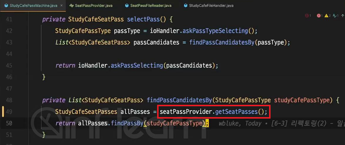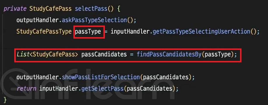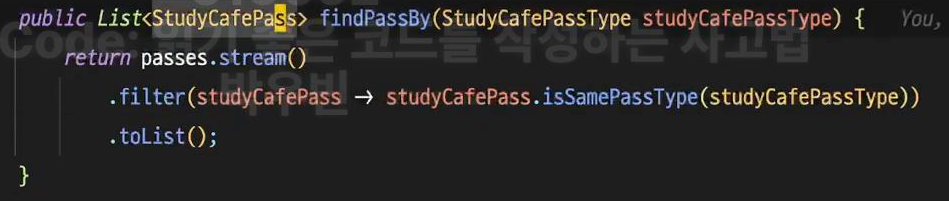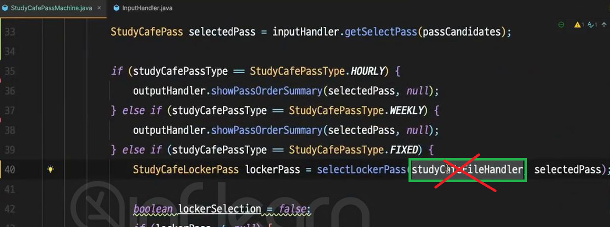 - FileHandler라는 구현체는 passReader로 숨겼는데 기존에 사용하고 있던 readStudyCafePasses()가 애매해졌다.