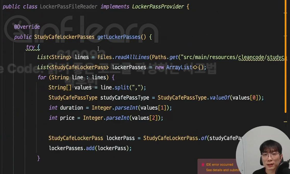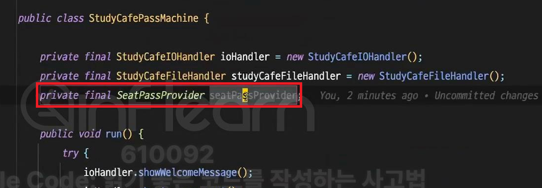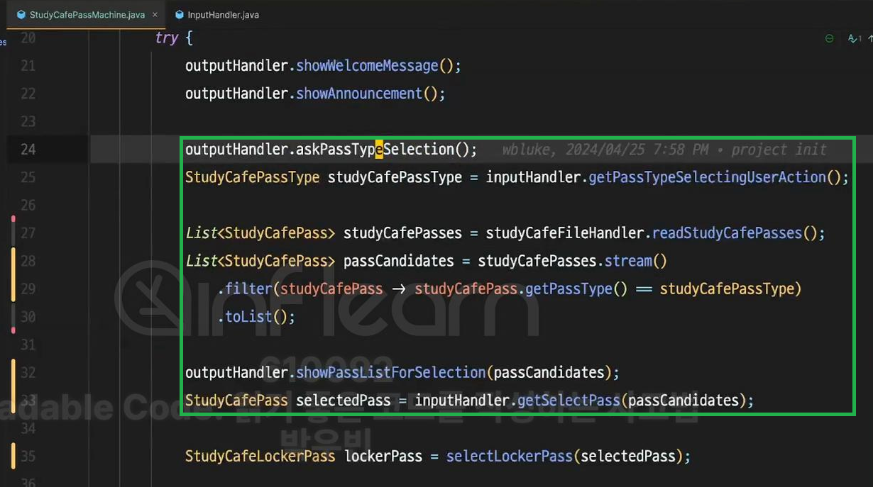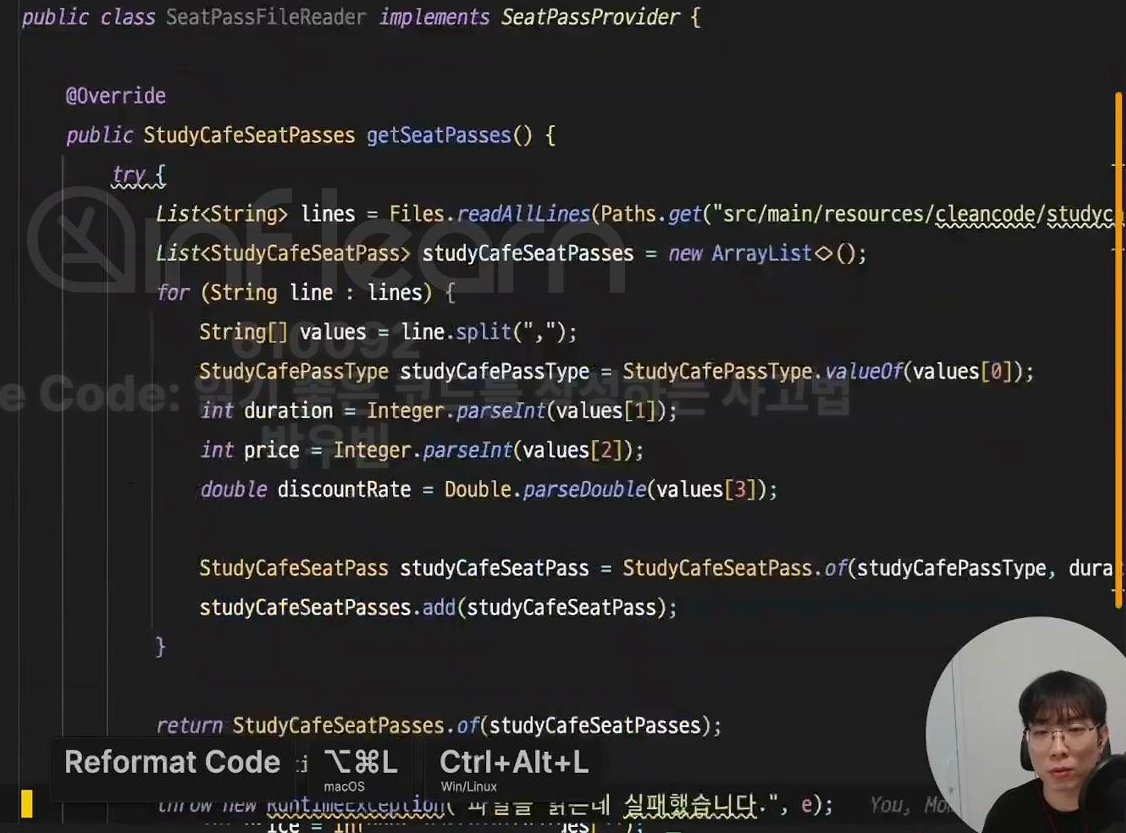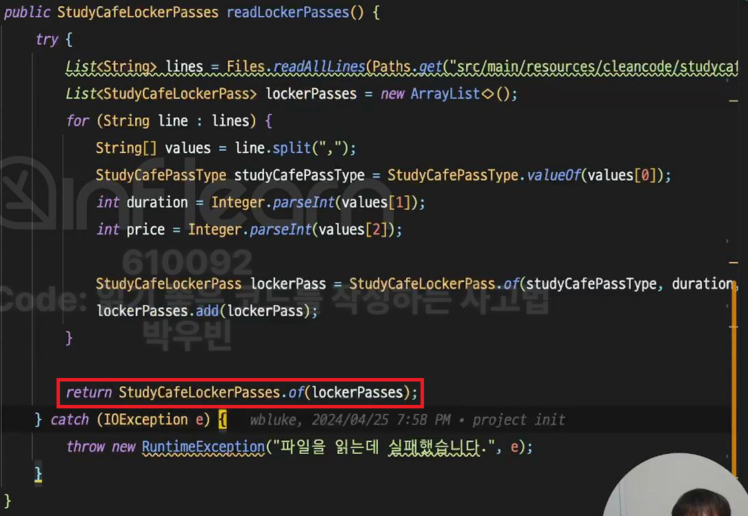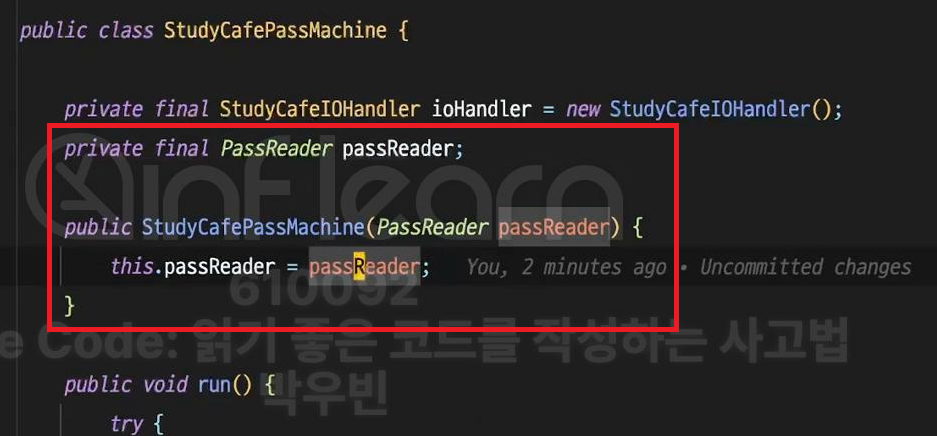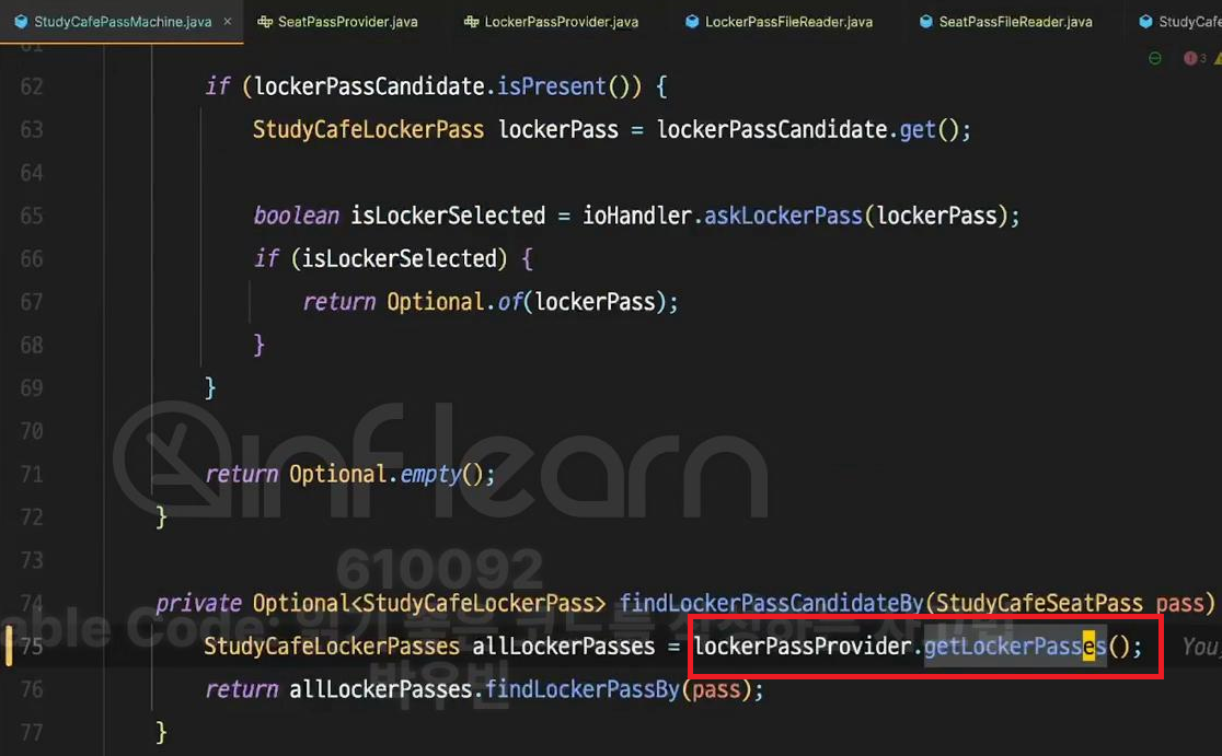 - FileHandler라는 구현체는 passReader로 숨겼는데 기존에 사용하고 있던 readStudyCafePasses()가 애매해졌다.