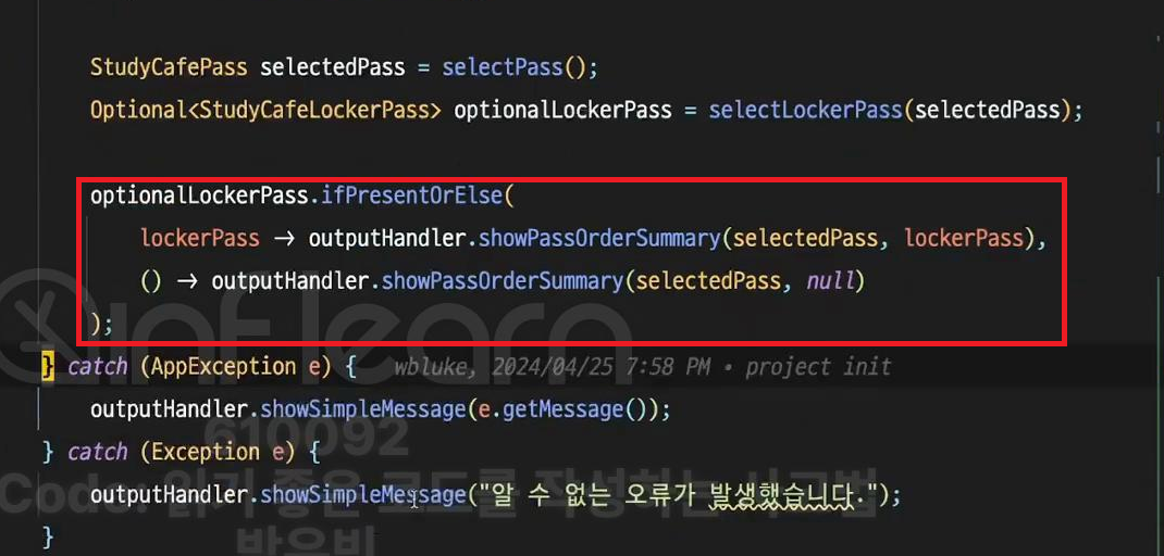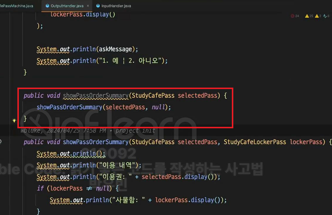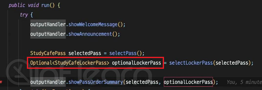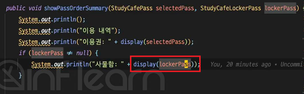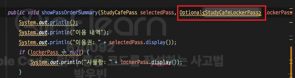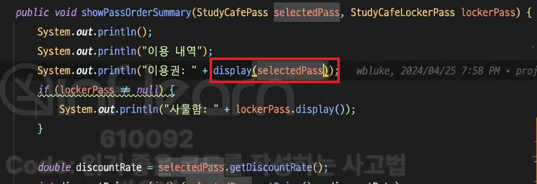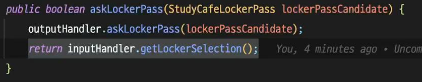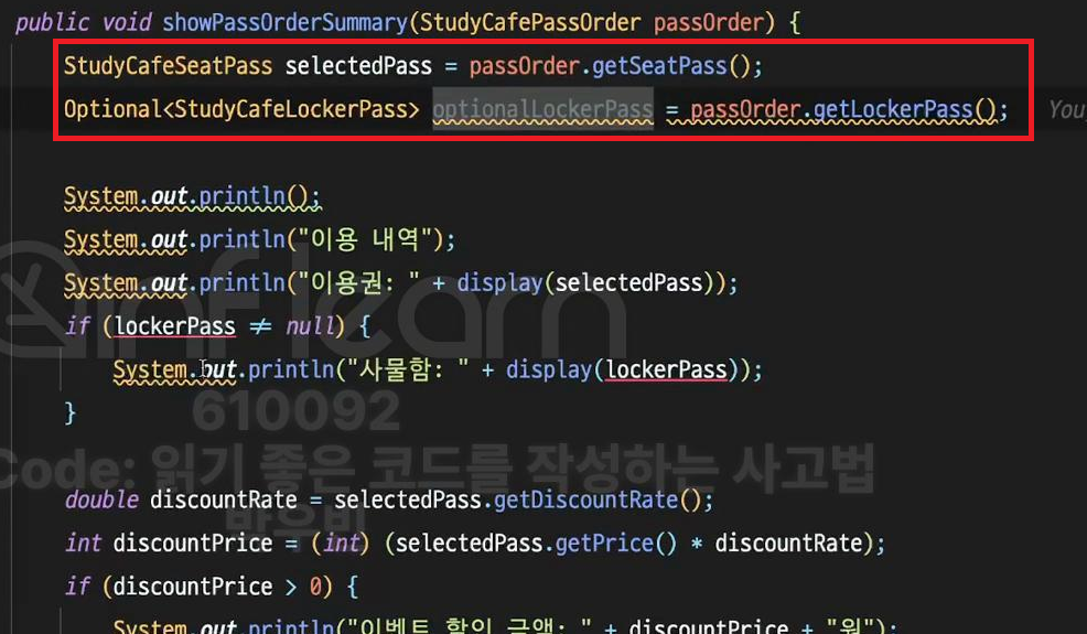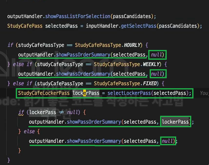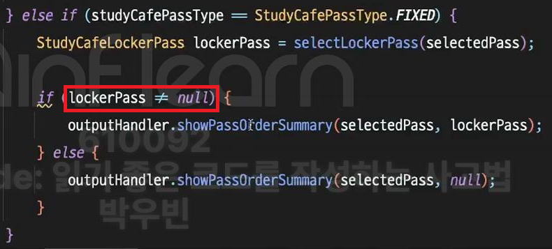 - outputHandler.showPassOrderSummary() 메서드에서 StudyCafeLockerPass를 필요로 하지 않으면 두번째 파라미터를 null로 하고 있다.
