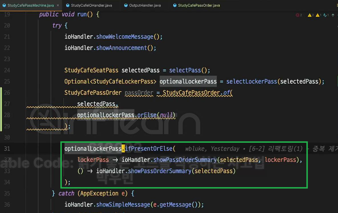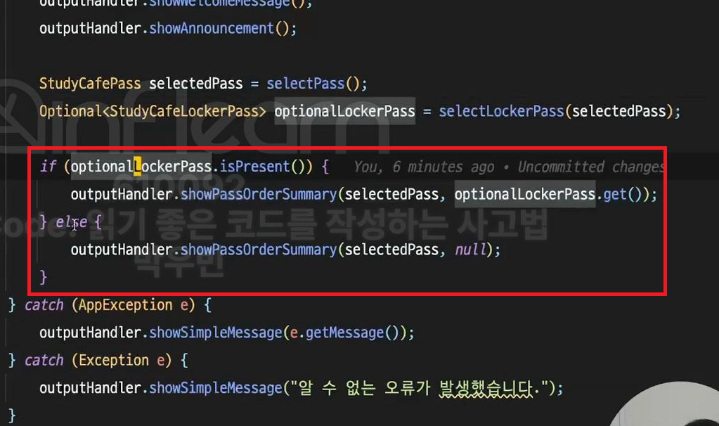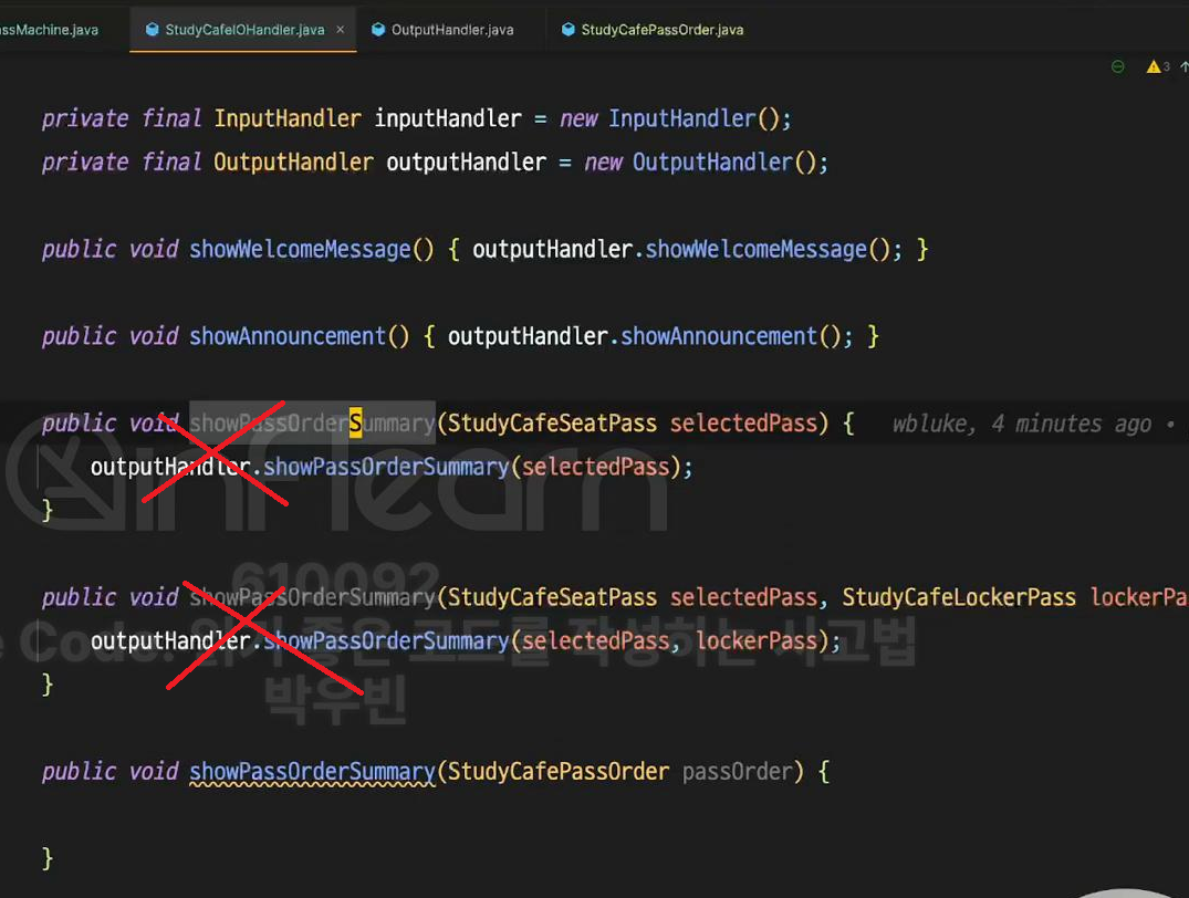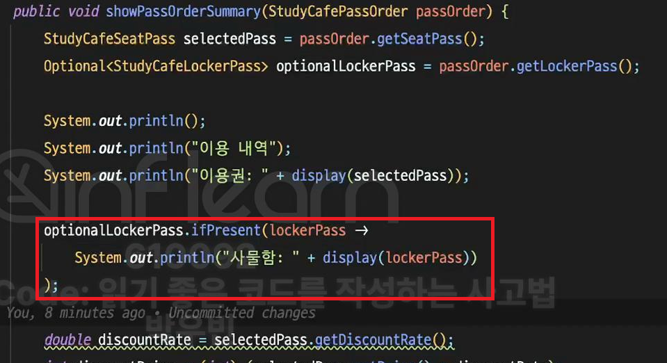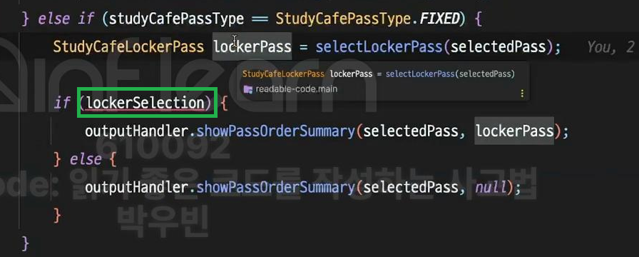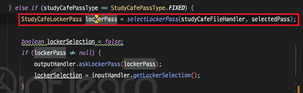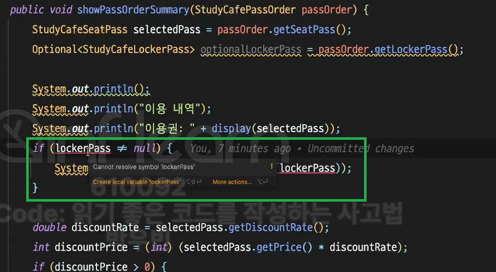 - outputHandler.showPassOrderSummary() 메서드에서 StudyCafeLockerPass를 필요로 하지 않으면 두번째 파라미터를 null로 하고 있다.