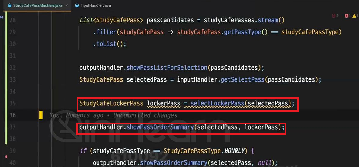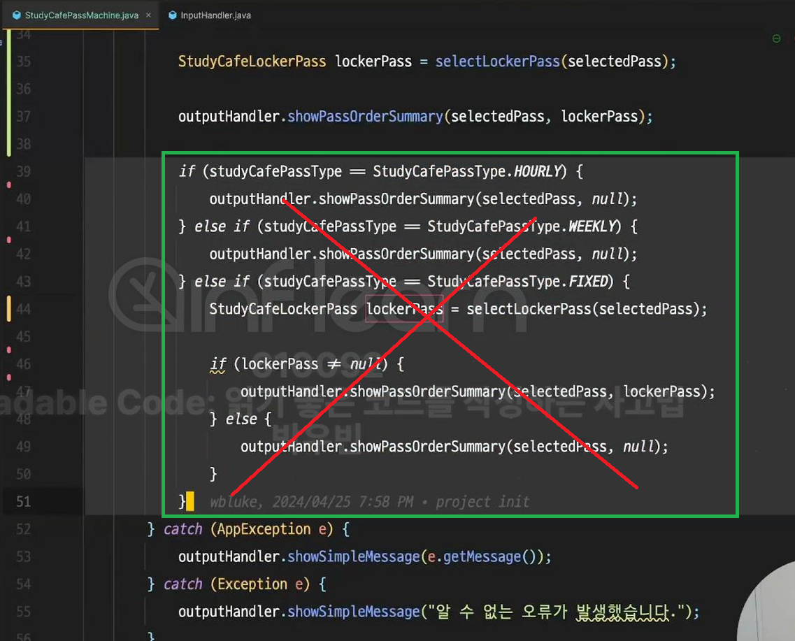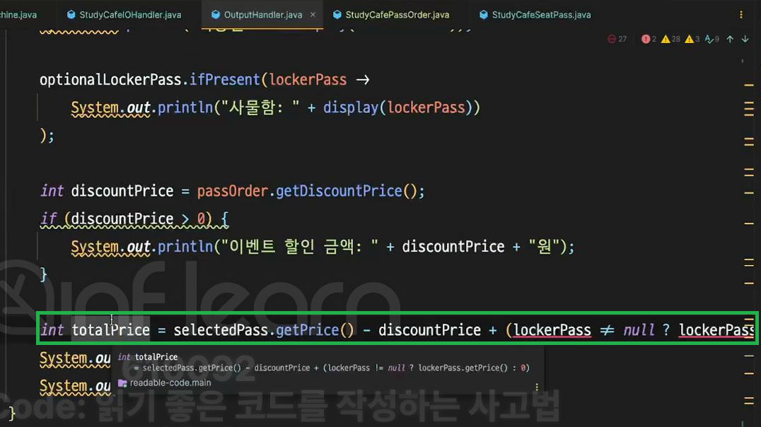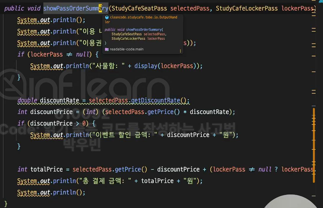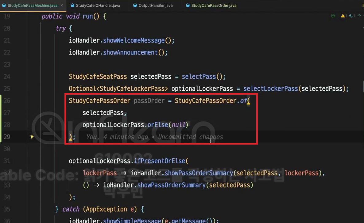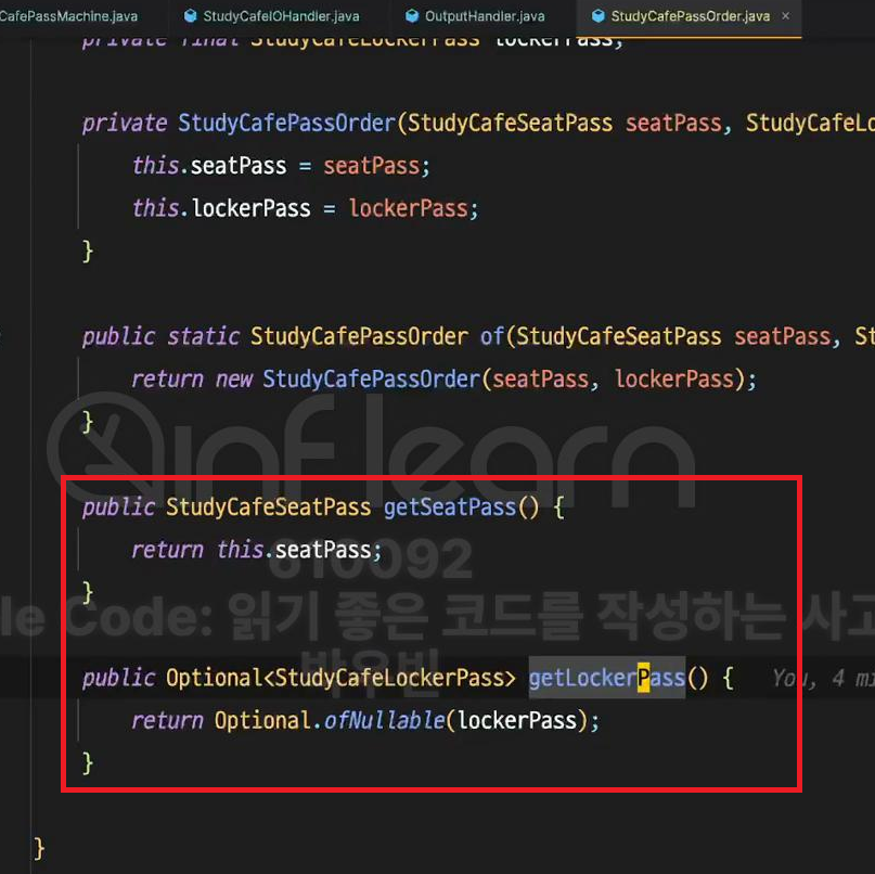 - outputHandler.showPassOrderSummary() 메서드에서 StudyCafeLockerPass를 필요로 하지 않으면 두번째 파라미터를 null로 하고 있다.