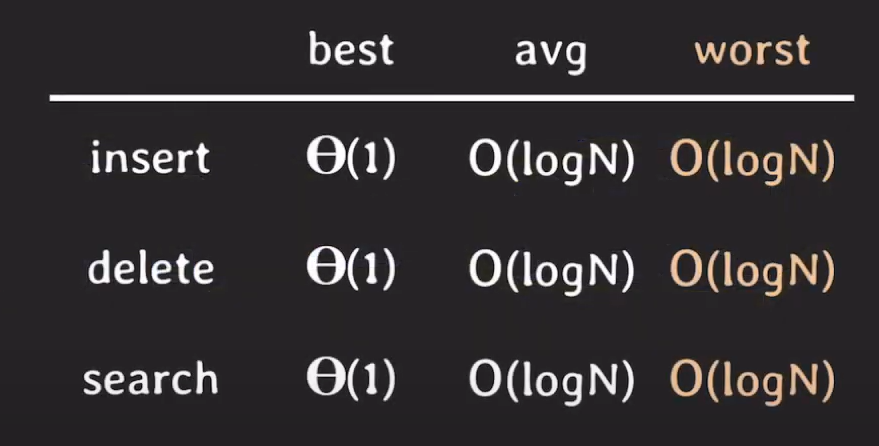 최종적으로 AVL 트리는 위와 같은 시간복잡도를 갖습니다. 이전의 이진 탐색 트리의 경우 최악의 경우 O(n)이었지만 AVL 트리는 O(logN)으로 개선된 것을 확인할 수 있습니다.