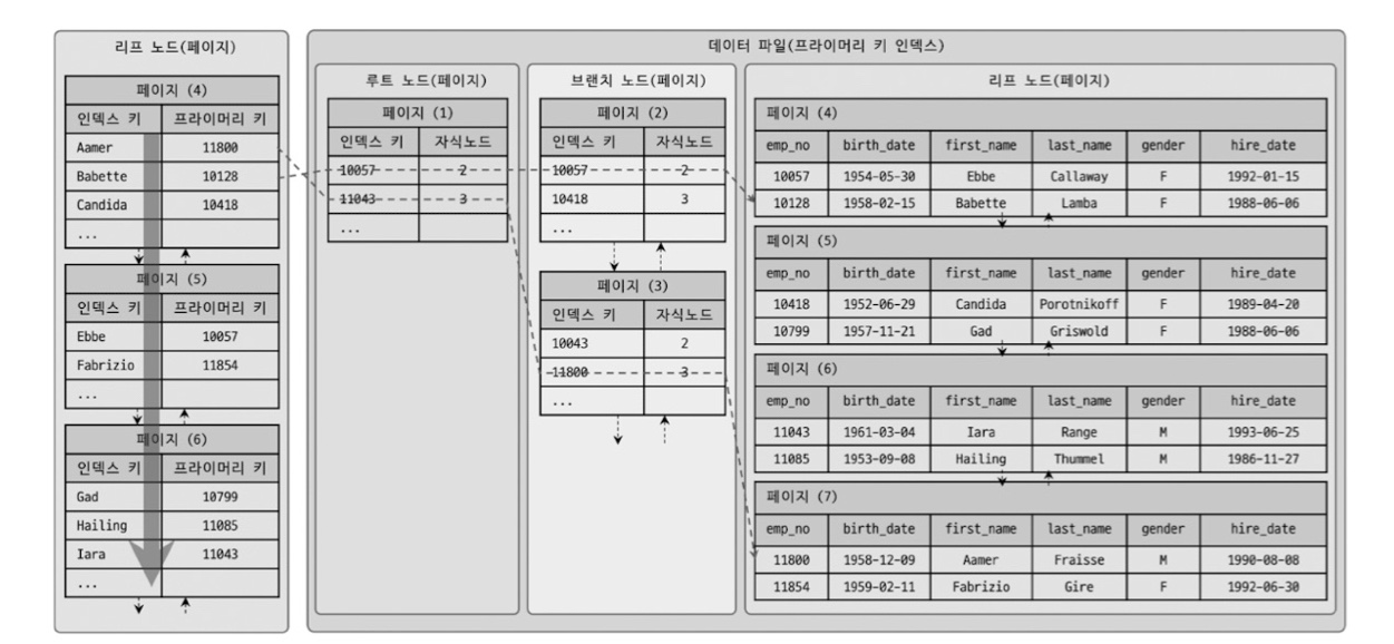 데이터베이스에서는 인덱스와 실제 데이터가 저장된 데이터는 따로 관리하고, 실제 데이터를 찾아가기 위해서는 인덱스의 리프노드에 있는 주솟값을 활용해야 한다. 아래는 InnoDB 테이블에서 인덱스를 통해 레코드를 읽는 과정을 나타낸 사진이다.