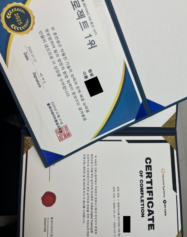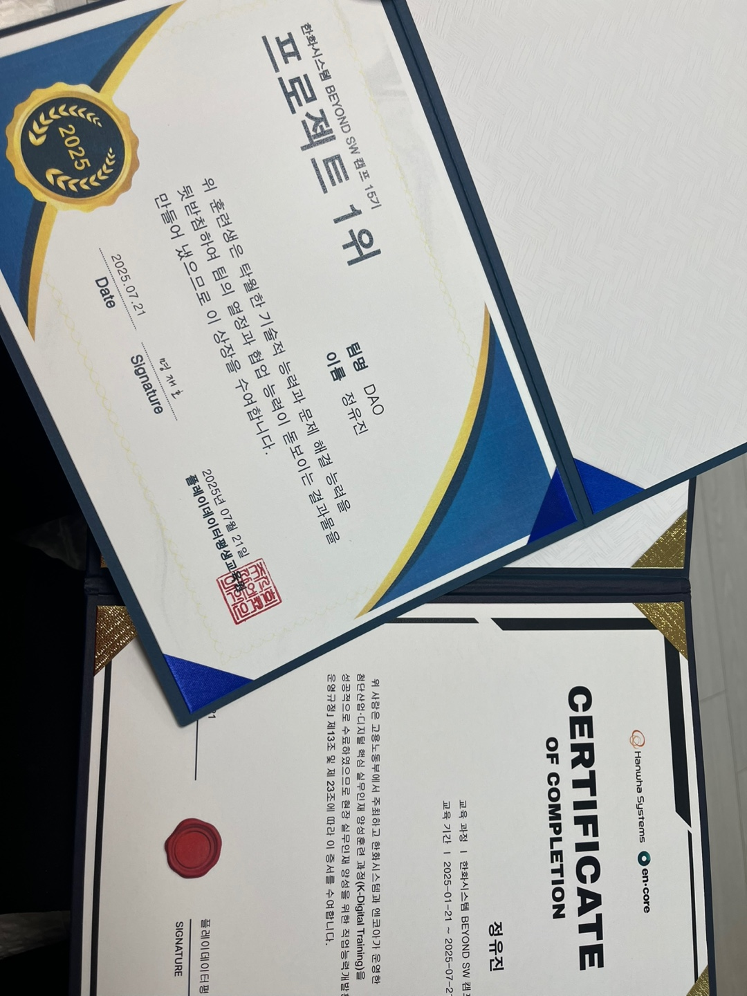 이 프로젝트 같은 경우에는 한화시스템 실무자 멘토님께서 멘토링을 진행해주셨다. 주제부터 여러 가지 실무에서의 고려 사항들을 말씀해주셨다. 나는 결재 시스템을 담당했고, 여기에 최종 발표까지 내가 맡아서 진행했다. 결과적으로 우리팀은 1등을 했고, 다른 팀보다 1명 적은 5명으로 진행했는데 정말 좋은 결과를 얻을 수 있었다. 사실, 정말 팀 운이 좋았다고 생각한다.