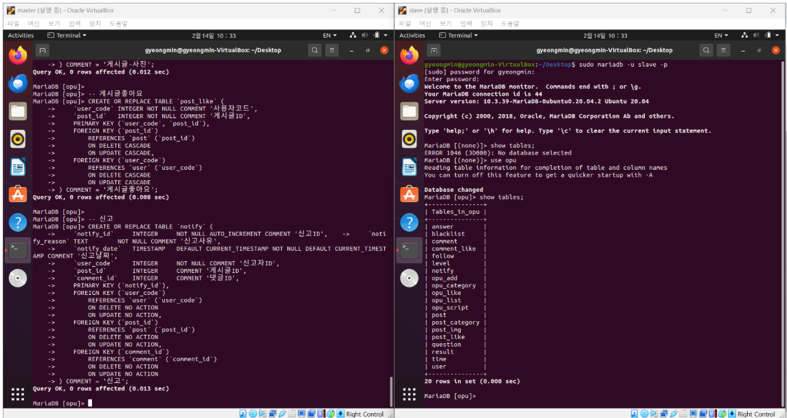 Git, Github, 요구사항 명세서, ERD 등을 배우고 소프트웨어 관련 기반 지식을 학습한다. 여기에 Mariadb를 이용해 SQL을 학습한다. 가장 마지막에는 Linux에 대해서 학습하는데, 이 기반 기술에서 학습하는 것 중 약간은 독특하다고 할 수 있는 것은 Linux를 이용해 Master/Slave 구조를 설정했다. 이것은 데이터 백업과 복구를 위한 과정이라고 생각하면 된다. 밑에 사진은 내 프로젝트에서 실제로 구성한 모습이다.