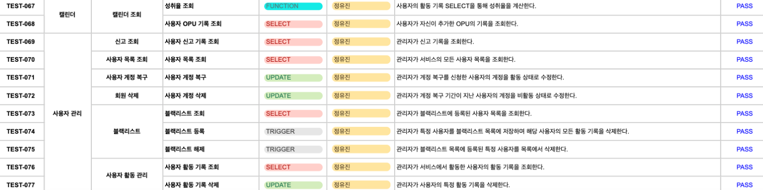 - 이렇게 테스트 케이스를 작성한 뒤에 각자 역할 분담을 한 뒤에 테스트가 완료된 부분에 PASS 표시를 하면서 테스트를 진행했다.