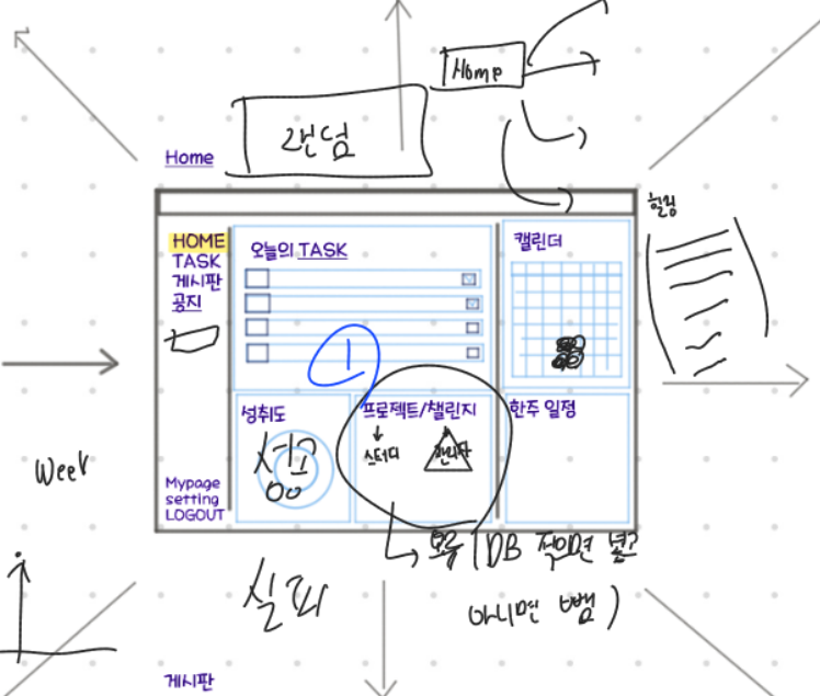 - 위에 그림처럼, 열심히 각자의 생각을 적으면서 어떤 사이트를 구현하는지 확실히 맞춰갔는데 이 과정 덕분에 다음 단계를 수월하게 진행할 수 있었다.