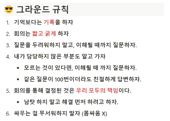 팀은 처음에 PCCE 스터디를 함께 진행했던 팀으로 구성됐다. 팀이 구성 된 이후에 우선 그라운드 룰을 정했다. 밑에 사진은 프로젝트를 진행하면서 정한 룰로, 프로젝트가 끝난 지금 규칙을 다 잘 지킨 것 같다.