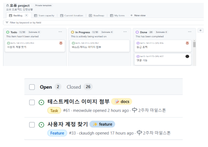 - 조원들이랑 함께 테스트 케이스 부분은 깃허브 협업 관리 기능을 통해 이렇게 작성하면서 각자의 진행상황을 확인했다.