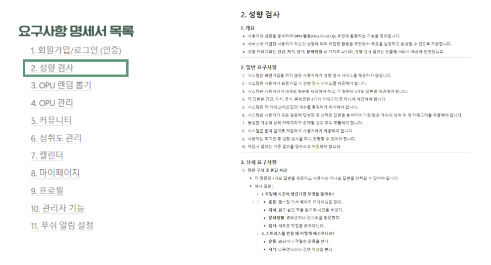 개요, 일반 요구사항 (주로 시스템에게 요구되는 부분), 상세 요구사항 (사용자의 요구사항), 용어 정리 , 예외 상황 및 대응, 서비스 흐름 예시, 추가 연계 기능 순으로 정리 되어 있다.