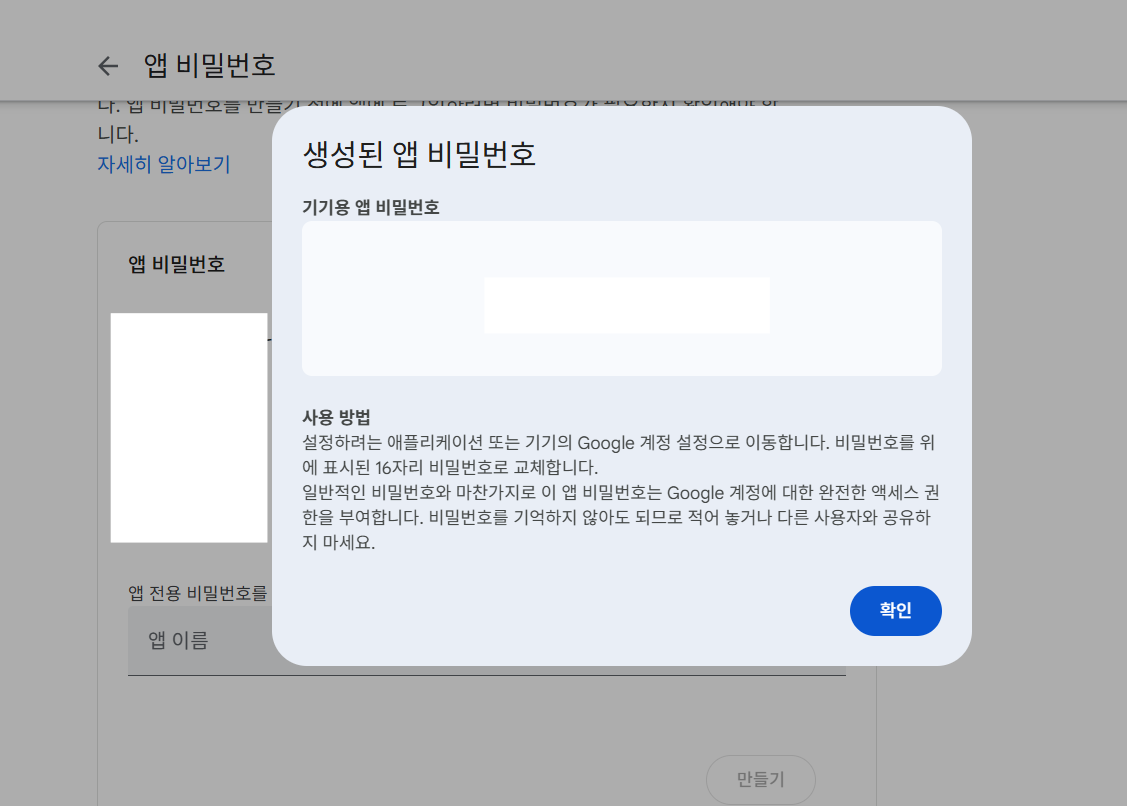 (4) 2단계 인증 → 앱 비밀번호 → 앱 비밀번호 발급 받기