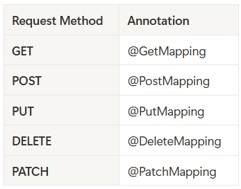 Spring 4.3 버전부터는 @RequestMapping을 좀 더 구체화 해 @GetMapping, @PostMapping, @PutMapping, @DeleteMapping, @PatchMapping 등의 어노테이션을 제공한다. 밑에 사진은 각각의 메소드 별로 매칭되는 어노테이션을 보여준다.
