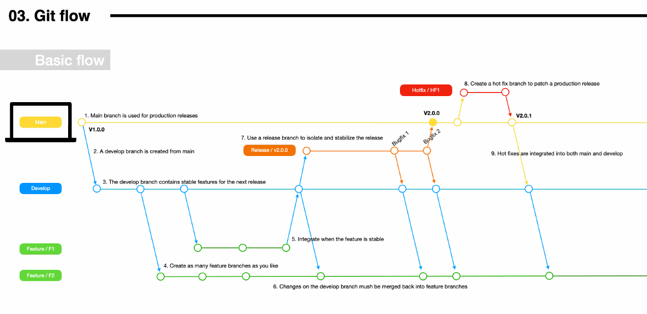 main branch 에서 바로 각자 branch를 파는게아니라 중간에 작업용으로 develop branch 를 판후 거기서 작업을함 (develop branch 가 사실상 main branch 느낌)