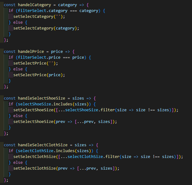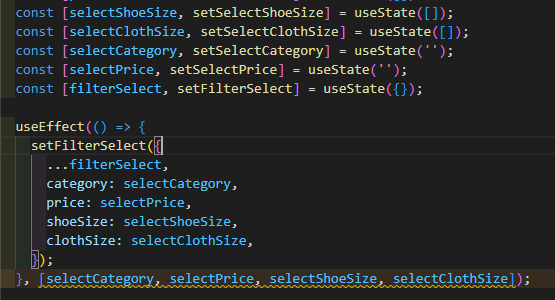 카테고리 중 에서도 어떤 것은 하나만 선택이 가능하고 어떤 것은 중복선택이 가능하기 때문에 useState에 담을 때 하나만 선택이 가능한 카테고리는 문자열('') , 중복선택이 가능한 카테고리는 배열([ ]) 형태로 저장함.