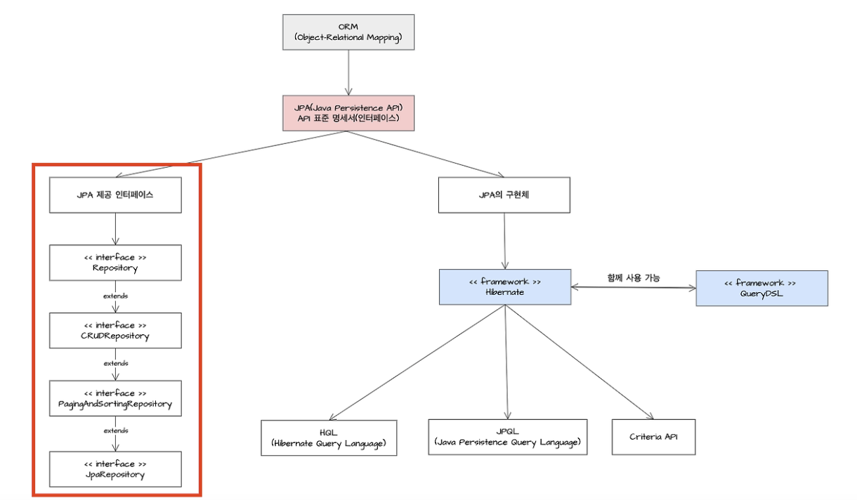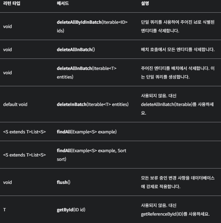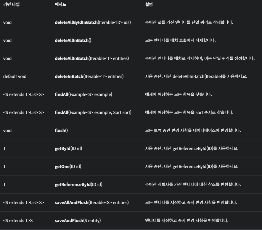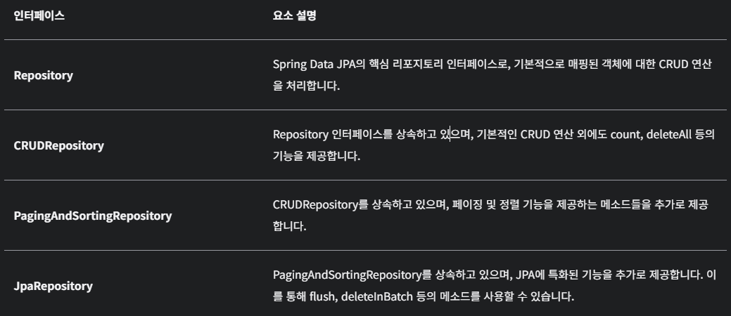 - Spring Data JPA에서 제공하는 인터페이스로, 개발자가 JPA를 더 쉽게 사용할 수 있도록 도와줍니다.