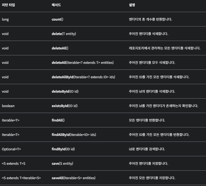 - Spring Data JPA에서 제공하는 인터페이스로 기본적인 CRUD 작업에 필요한 많은 메서드를 미리 정의해 놓고 있다.