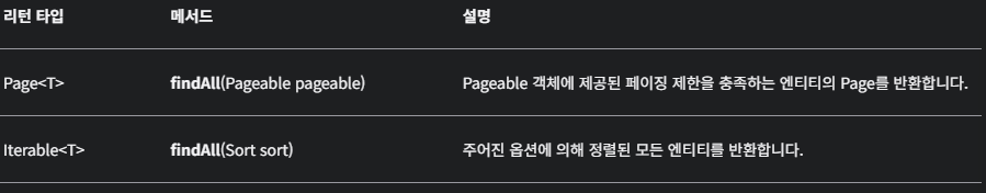 - Spring Data Repository의 하나로, 페이징 및 정렬 기능을 제공합니다. 이 인터페이스를 사용하면 개발자는 페이징 및 정렬 기능이 포함된 CRUD 작업을 수행할 수 있다.