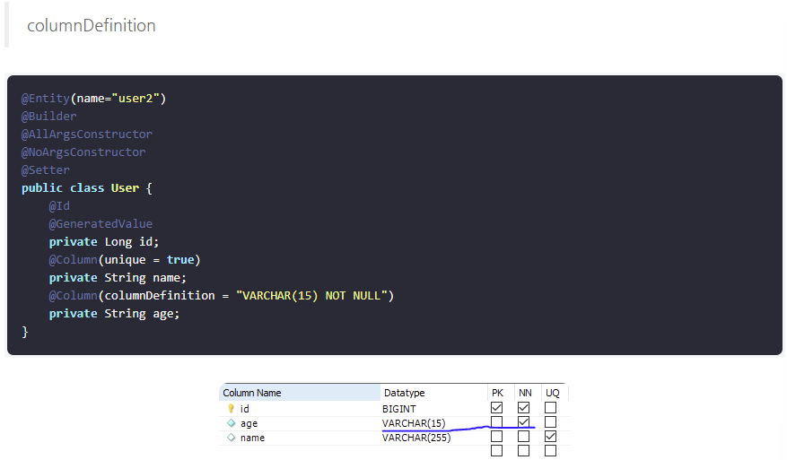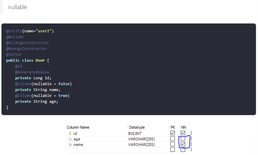 위의 결과는 nullable true, false에 따라 not null이 적용되는지 여부이다.