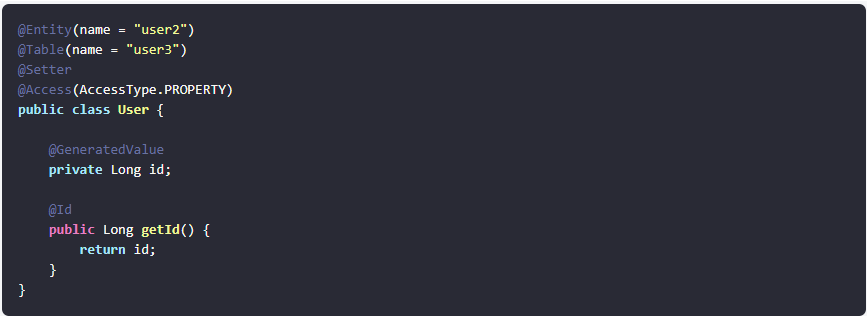 아래 처럼 getter에 @Id를 설정함으로 써 프로퍼티 접근으로 할 수 있다. 아래와 같은 경우 @Id가 getter에 위치하므로 @Access를 생략할 수 있다.