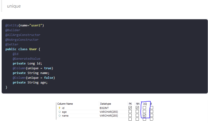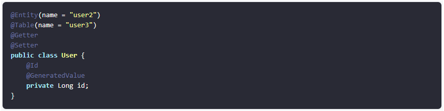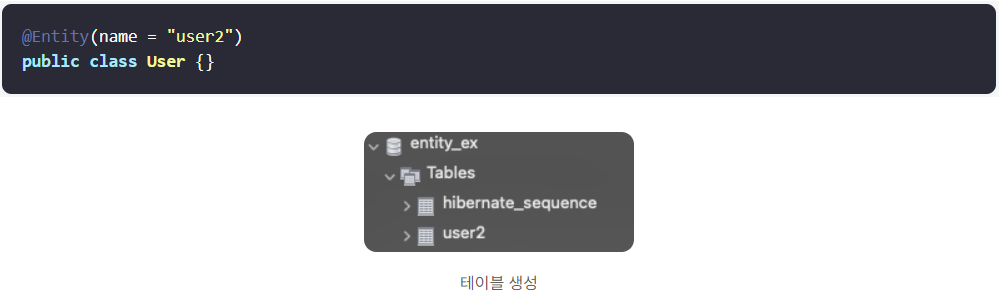 아래 코드 결과를 보면 @Table에 name을 추가하면 테이블 이름이 name값으로 설정이 되고 생략시 Entity 이름으로 테이블이 만들어지는 것을 확인할 수 있다.