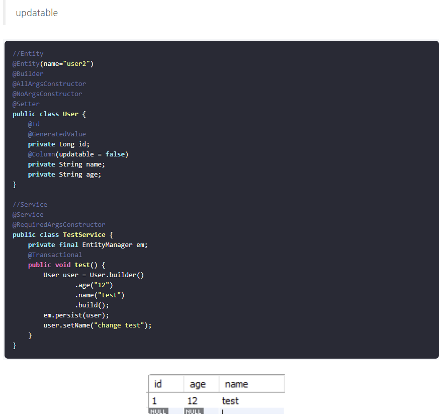 위의 결과는 User 엔티티 name 컬럼에 "test"를 입력하고 "change test"로 변경해도 변경값이 적용되지 않는다.