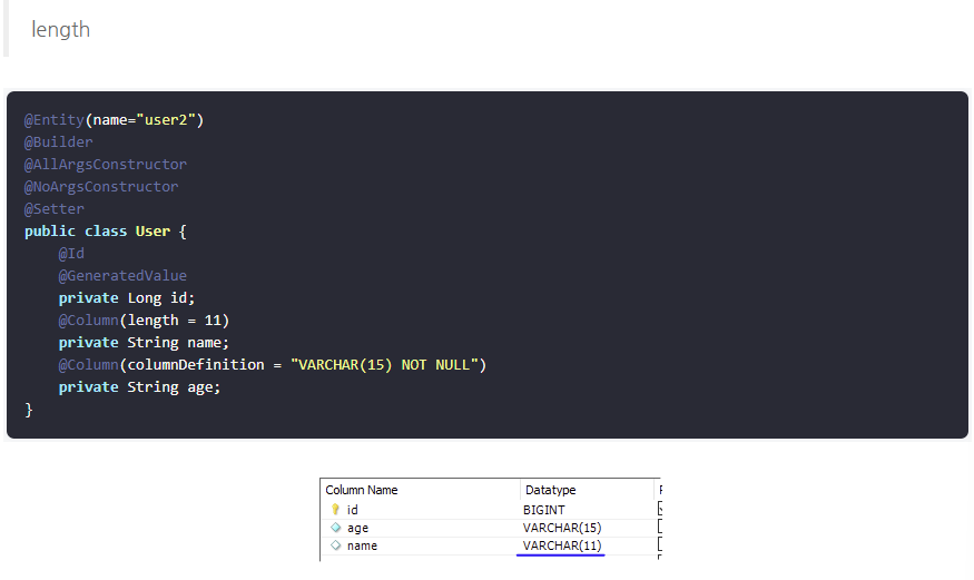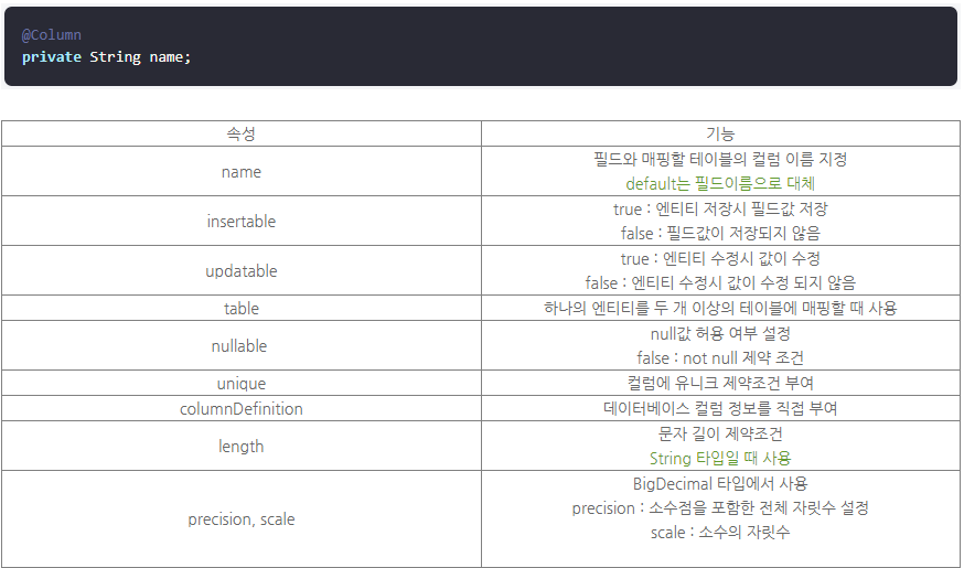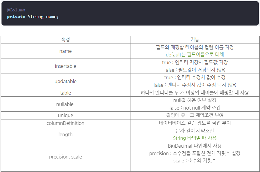 @Column은 객체 필드를 테이블 컬럼과 매핑한다.