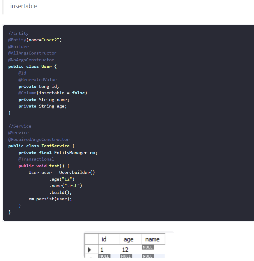 위의 결과는 User 엔티티에 name 컬럼에 "test"를 입력해도 DB에는 값이 들어가지 않는다.