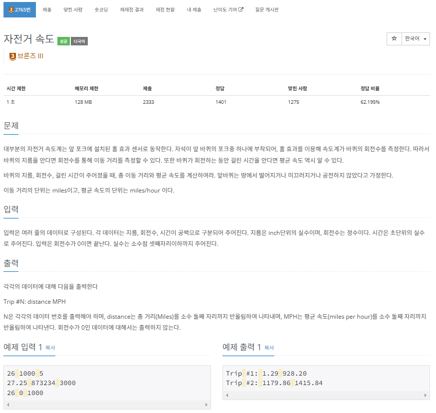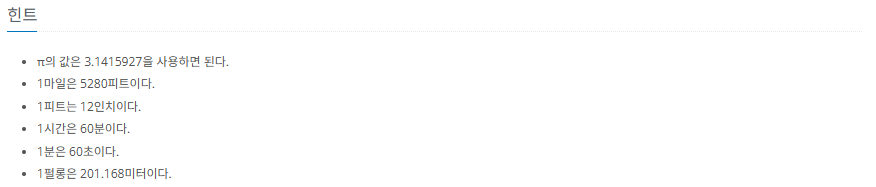 문제는 간단한데 수학적으로 계산식이 필요하다. 거리, 속력, 시간의 공식을 사용하고, 단위는 밑에 힌트에 있듯이 계산을 해주면 된다. 여기서 format의 변형시켜서 출력을 쉽게 할 수 있다.