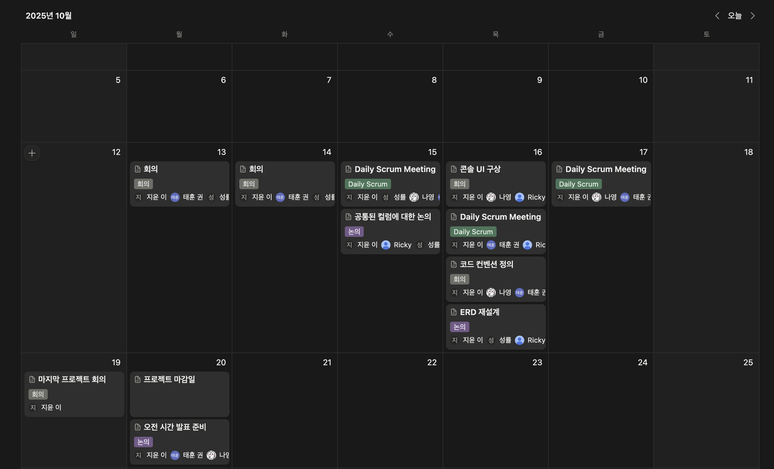 각자 프로젝트 구현 시작 전 Daily Scrum을 작성하며 마지막에는 목표량을 달성했는지 확인도 하며 "실무에서 이런 식으로 진행하겠구나!"를 느낄 수 있었어요.