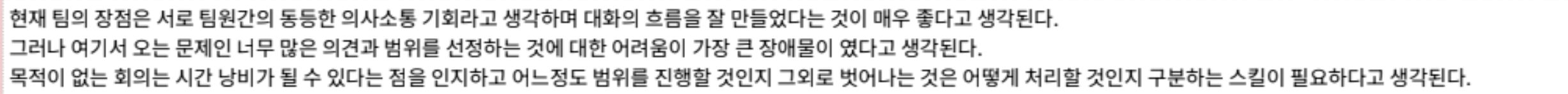 이 과정을 통해서 논의 중에도 본질을 벗어나는 주제에 대해서는 멈출 줄도 알아야 한다는 것을 깨닫게 되었어요.
