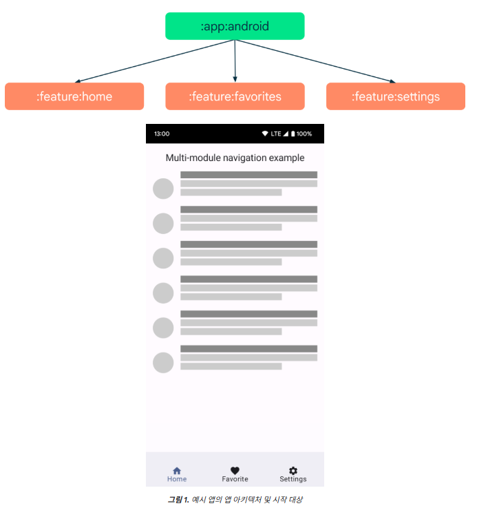 각 feature 모듈이 하나의 기능(예: 홈, 설정, 즐겨찾기 등)에 초점을 맞춘다. 해당 기능을 구현하는 데 필요한 모든 목적지들을 캡슐화하는 single navigation graph를 제공한다.