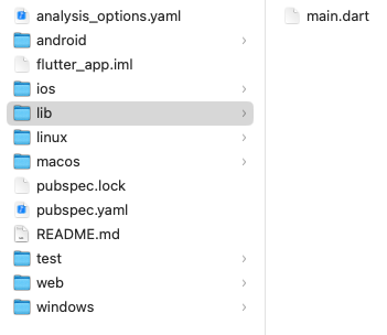 Flutter 프로젝트를 새로 만들면 아래와 같은 폴더구조를 가진다.