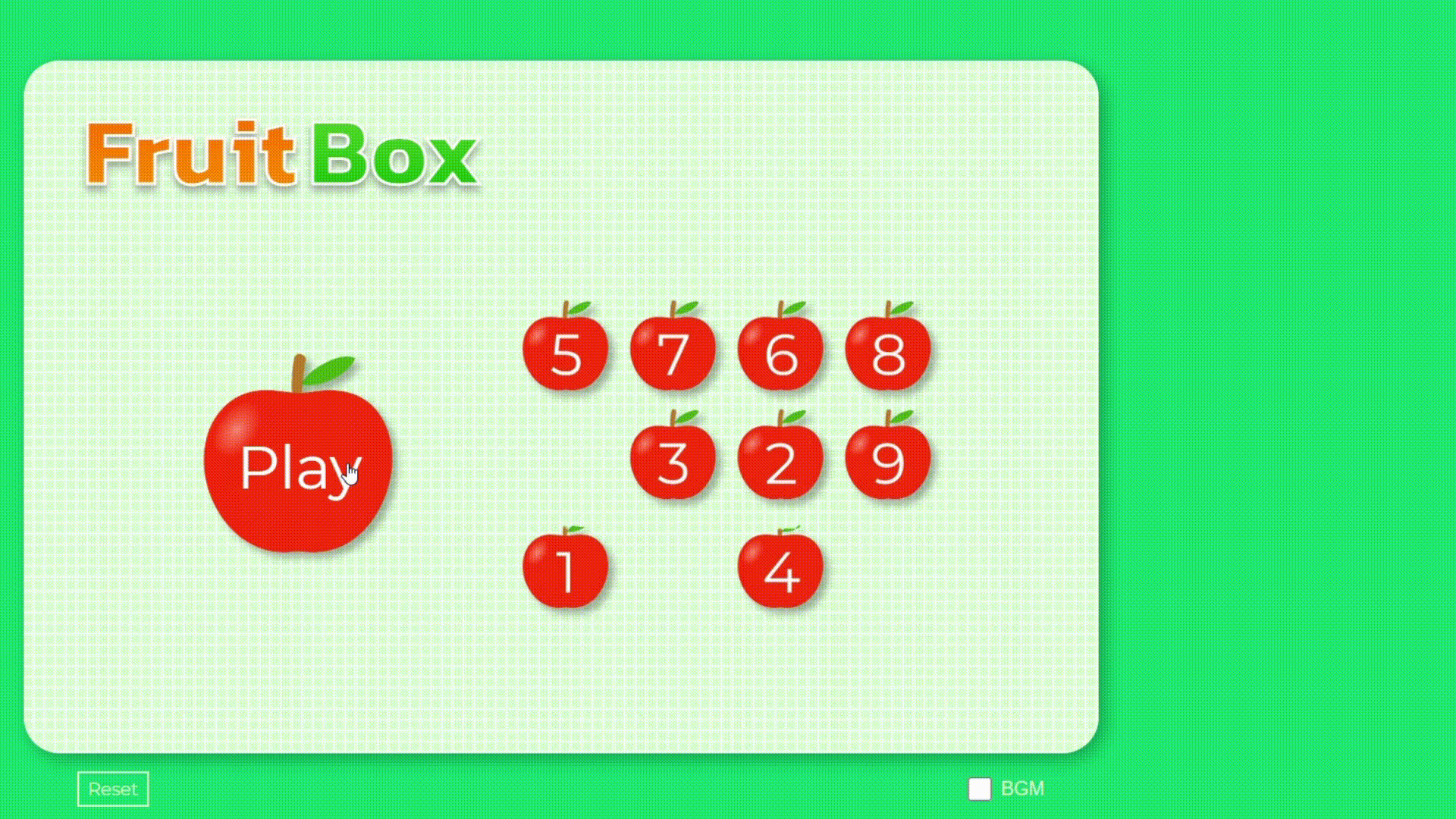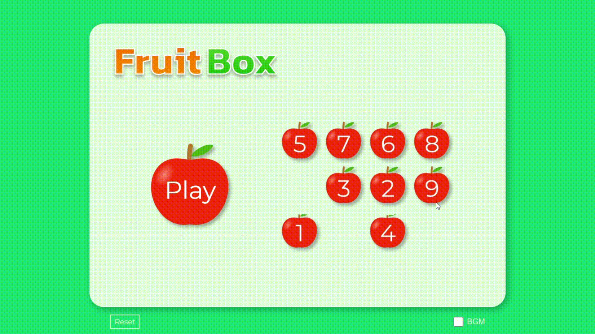 드래그로 사각형 범위 내의 사과를 선택해 5px 노란색 테두리로 표시하고, 합계가 10의 배수일 때 사과를 제거할 것.