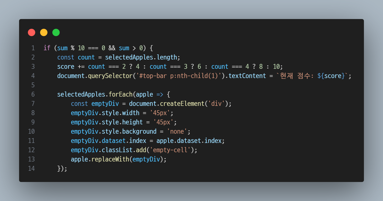 .game-apple에 마우스 이벤트 연결const apples = document.querySelectorAll('.game-apple');