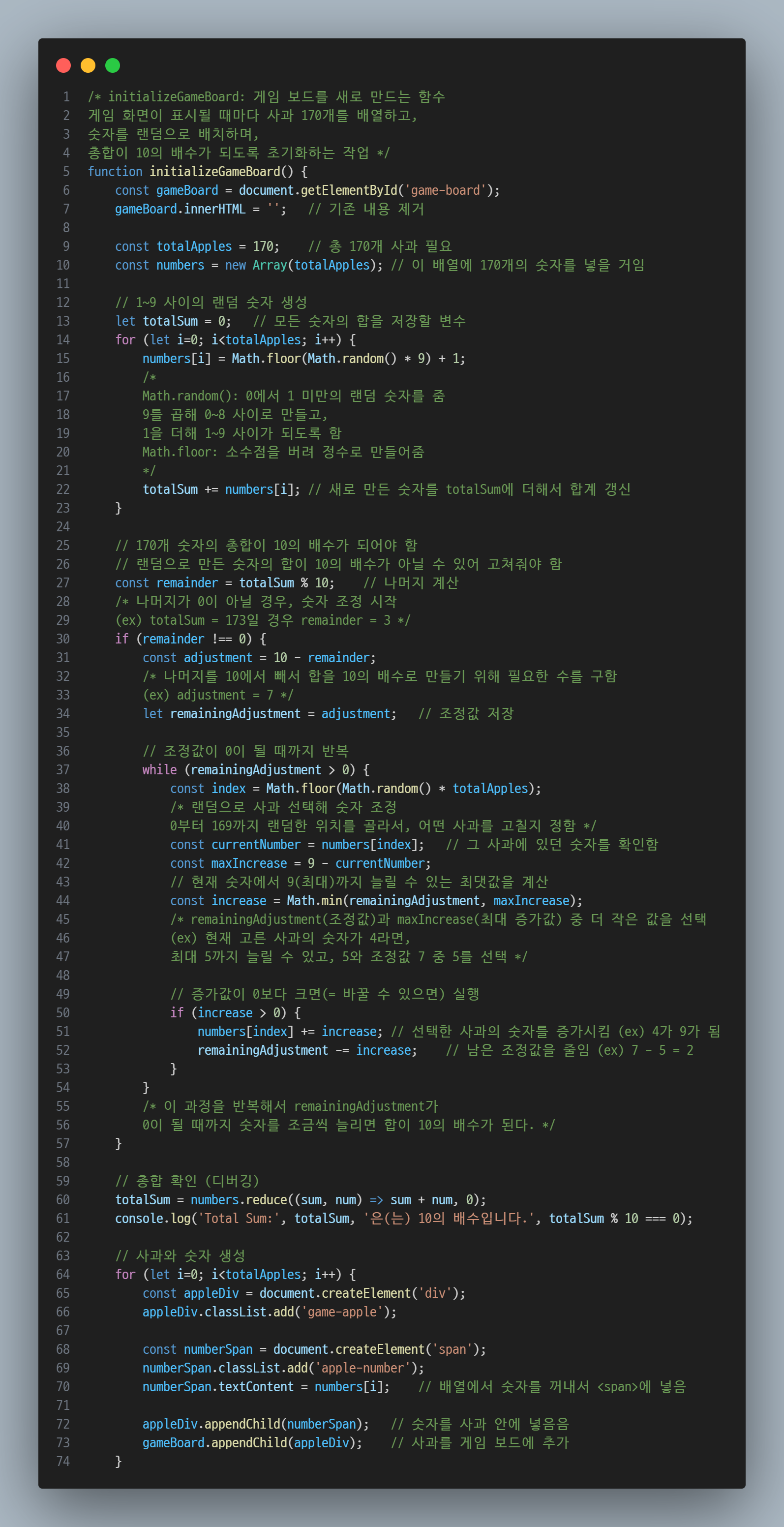 근데 무작정 랜덤은 아니고, 판의 숫자의 총합이 10의 배수로 딱 떨어지는 선에서 랜덤으로 나오게 지정해야 함