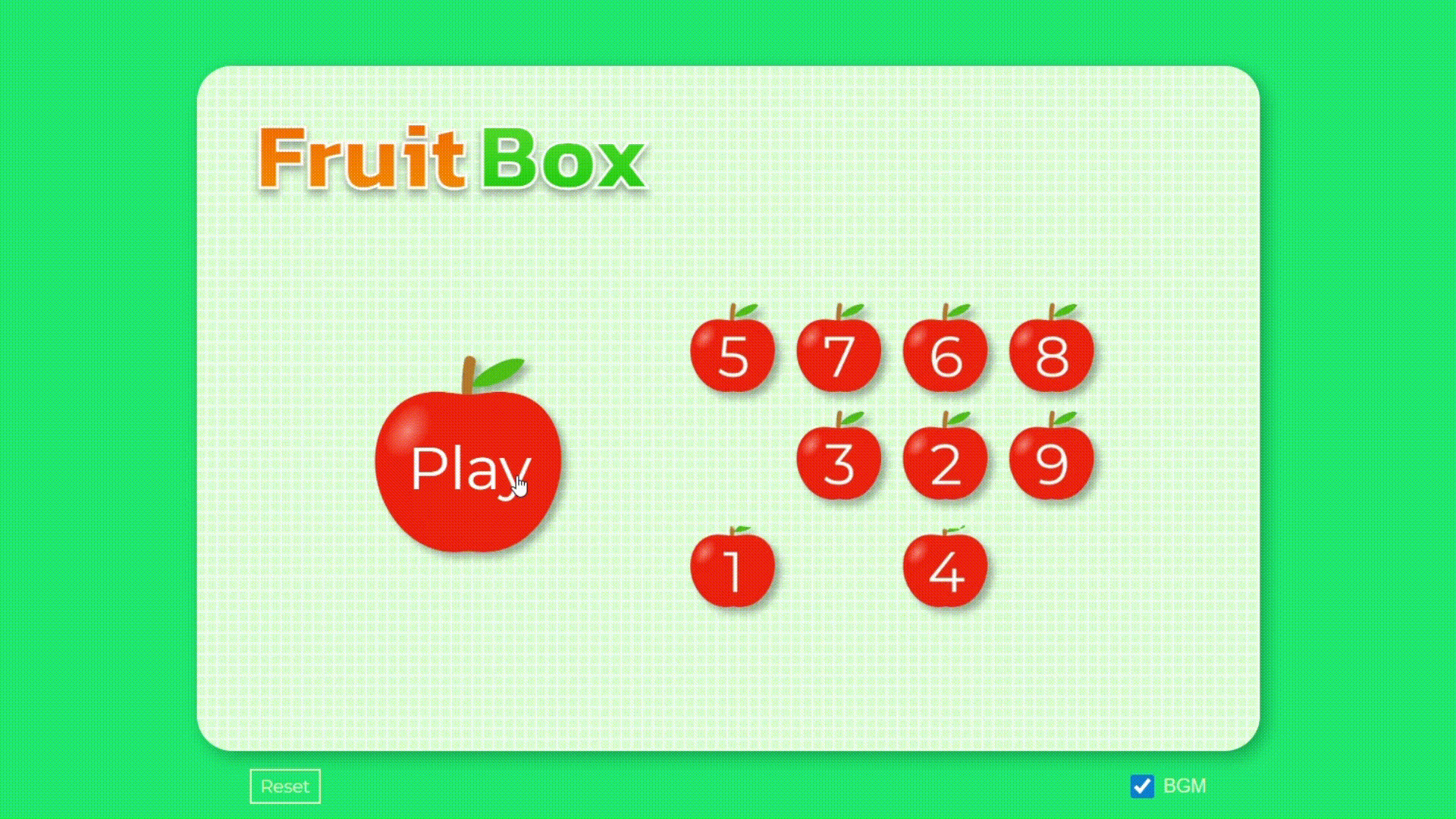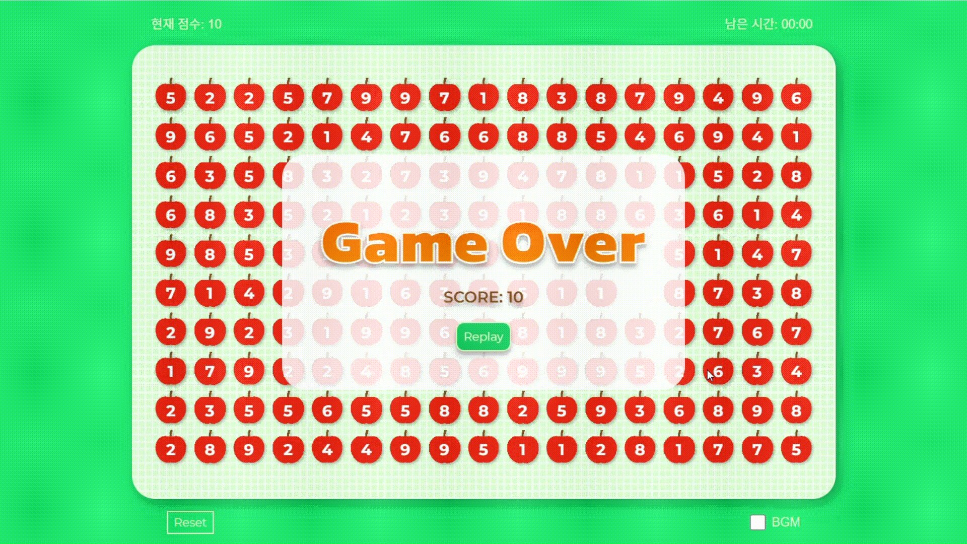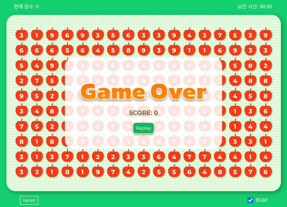 → 사과의 개수는 가로×세로 = 17×10 =170개- 제한 시간 2분 타이머 기능 ⏱️