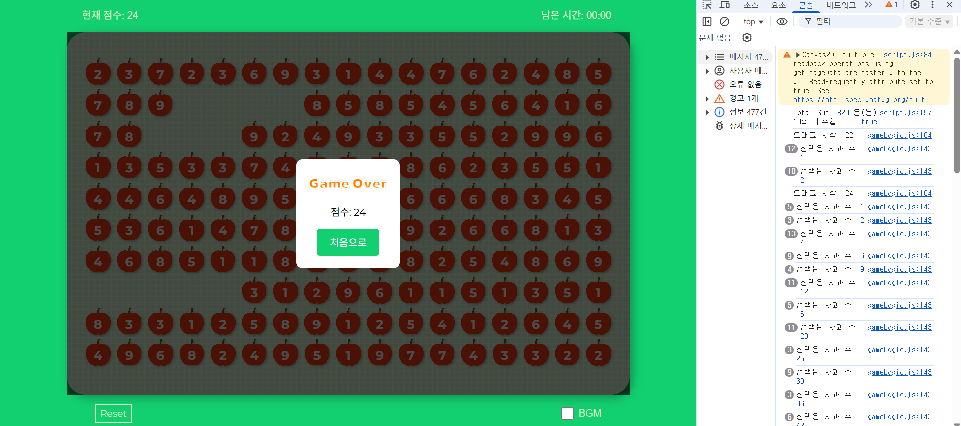 패턴 배경은 원본 사과게임 사이트에서 개발자 도구(F12) 열어서 이것저것 뒤져보다가 얻었음.