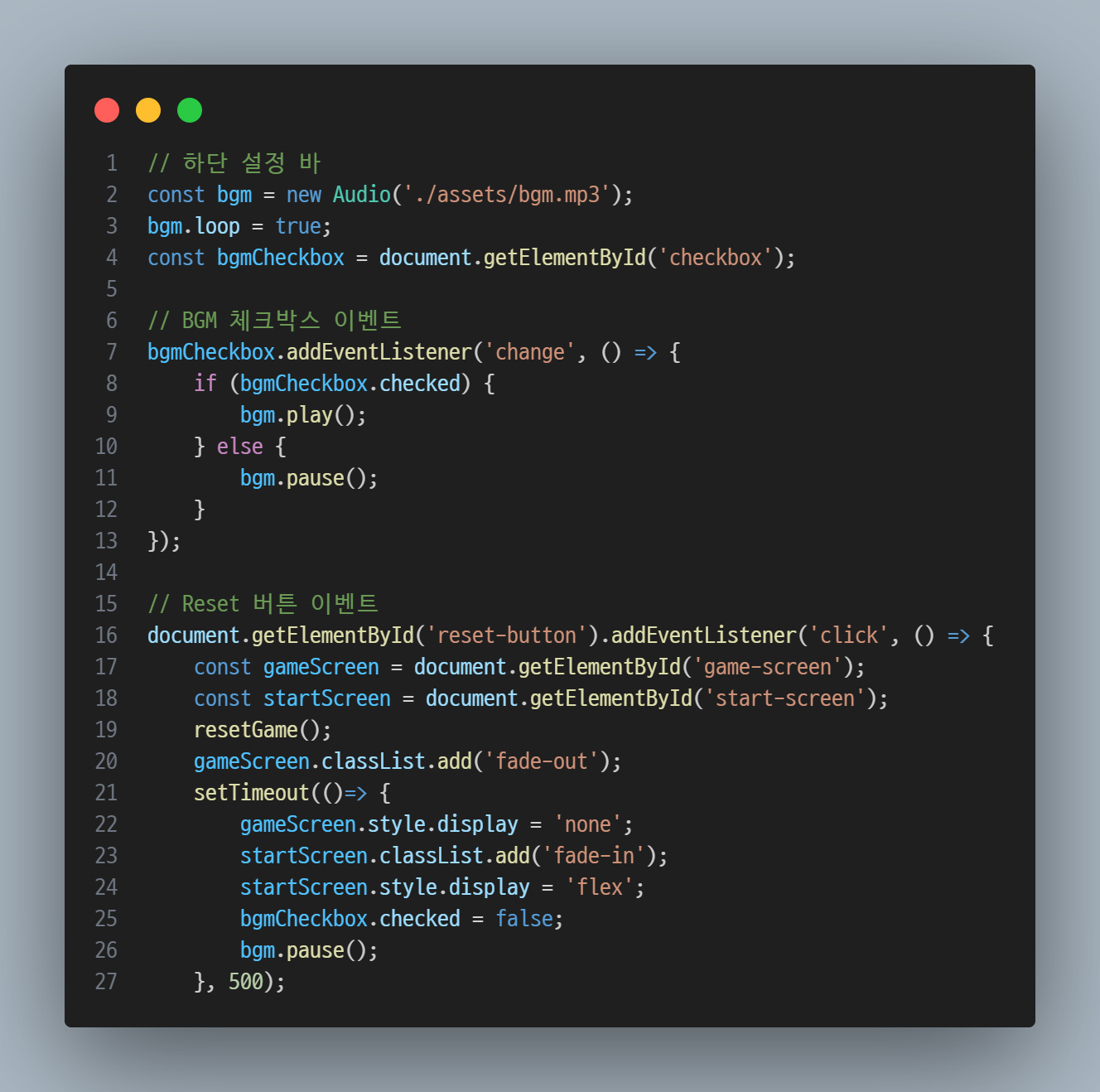 설정 바가 뭐냐면, 이전에 화면 하단에 만들어 두었던 Reset 버튼과 BGM 체크박스!