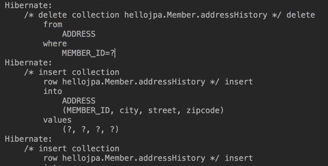 - 값 타입 컬렉션에 변경 사항이 발생하면, 주인 Entity와 연관된 모든 데이터를 삭제하고, 값 타입 컬렉션에 있는 현재 값을 모두 다시 저장함