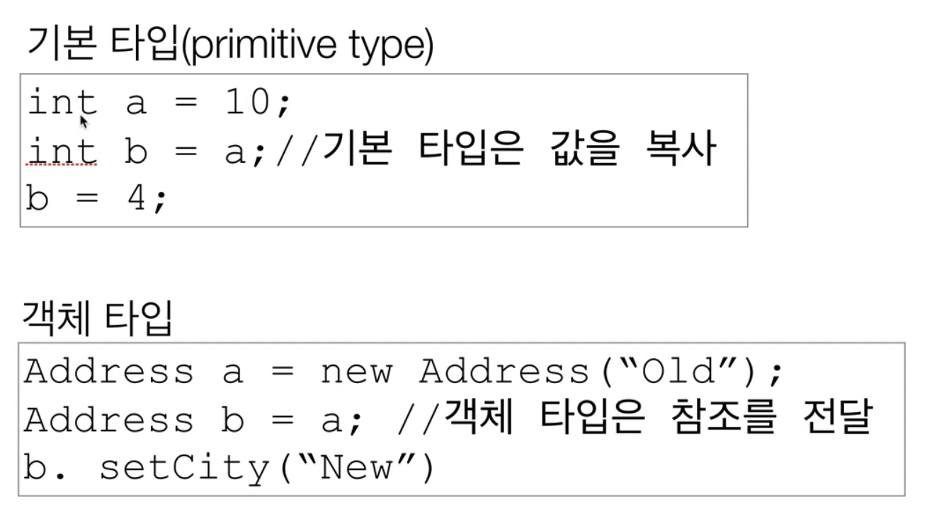 - 변수처럼 단순히 값으로 사용하는 자바 기본 타입이나 객체