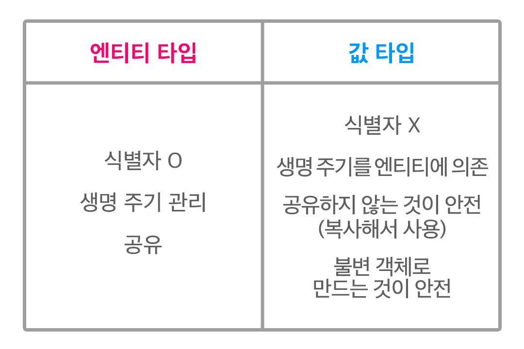 - 값 타입은 Entity와 다르게 식별자 개념이 없음