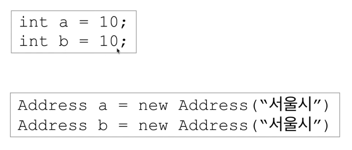 - 값 타입 : 인스턴스가 달라도 그 안에 값이 같으면 같은 것으로 봐야 함